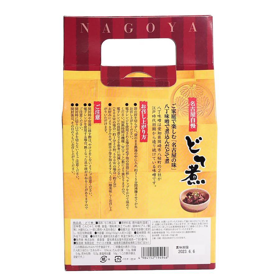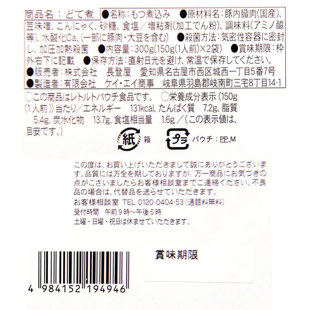 ■名称 もつ煮込み■原材料名 豚内臓肉(国産)、豆味噌、こんにゃく、砂糖、食塩/増粘剤(加工でん粉)、調味料(アミノ酸等)、水酸化Ca(一部に豚肉、大豆を含む)■内容量 300g【150g(一人前)×2袋】■賞味期限 製造日より365日■箱サイズ 縦23.5cm、横14cm、高さ5cm■保存方法 直射日光を避け、常温で保存して下さい。■販売者 株式会社 長登屋INT 名古屋市西区城西一丁目5番7号■製造者 有限会社 ケイ・エイ商事 岐阜県羽島郡岐南町三宅8丁目14-1■ 栄養成分表示(100g当たり)エネルギー131kcal たんぱく質7.2g 脂質5.4g 炭水化物13.7g 食塩相当量1.6g●この商品はレトルトパウチ食品です。