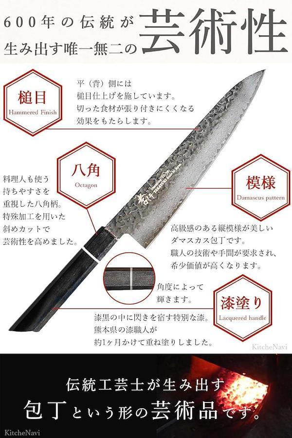 また、ブレードが綿密に研磨されているため、槌目やダマスカス模様が輝きを増すとともに、樫漆柄との色の対比がとても美しい一品となっております。