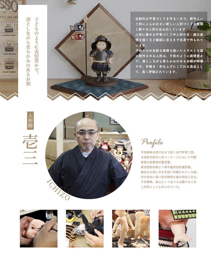 《 壱三 いちぞう 》壱三は四代目まで続く名門甲冑工房。全国新作節句人形コンクールにおいて内閣総理大臣賞特別賞受賞。東京都都知事より青年優秀技能賞受賞。機会ある度に日本全国に所蔵されている鎧、兜を実地に調べ研究精進を重ね現在に至る。平安晴峰、雄山という名でも活躍する人気人形師としても知られている。