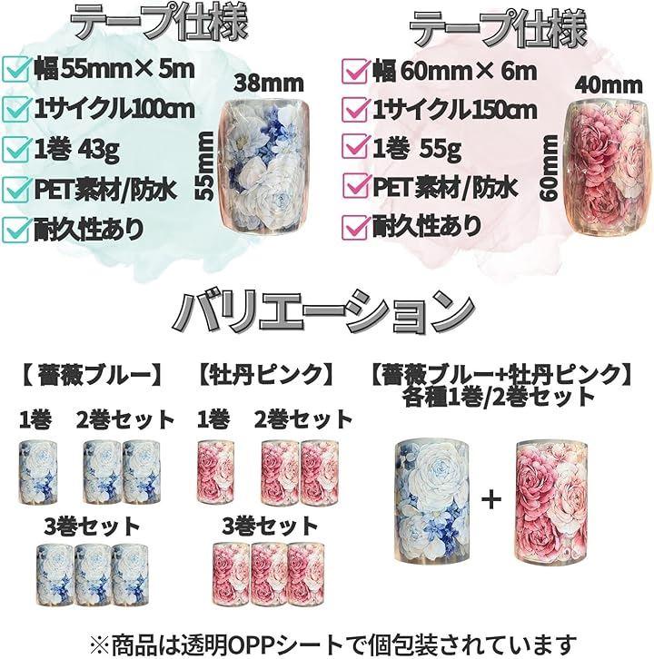 「素材」PET:光沢のある白インク剥離紙「サイズ」(薔薇、ブルー)1巻55mmx5m、1ループ約100cm (牡丹、ピンク)1巻60mmx6m、1ループ約150cm