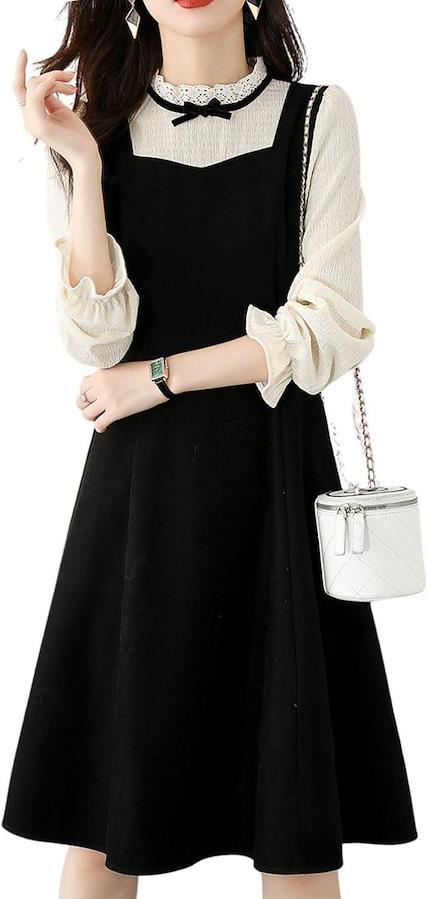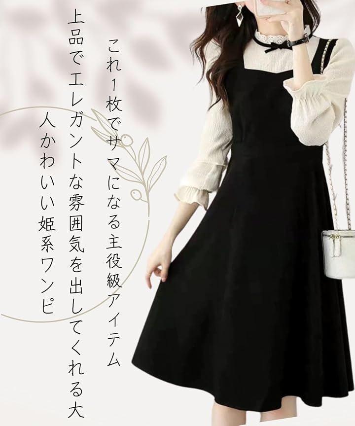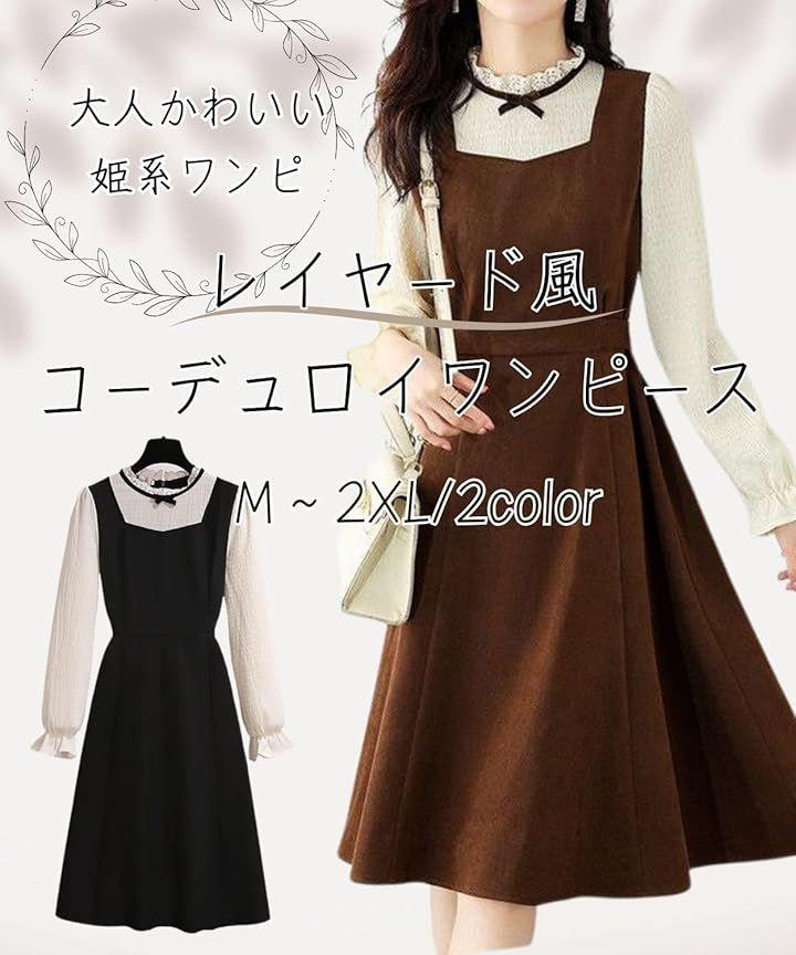 秋冬の季節にぴったりな「姫系xかわいい」ドッキングワンピースが登場。このワンピースは、ブラウスとスカートを組み合わせたようなセットアップ風のデザインで、リボン付きの立ち襟がエレガントな雰囲気を演出。
