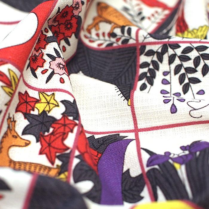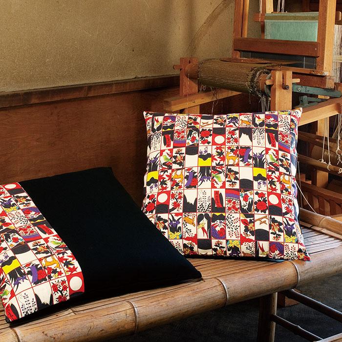表側はポップな花札柄と黒無地を、裏側は黒無地で作りました。かるたが発祥とも言われる花札は、1月は松、2月は梅と月替わりで花鳥風月が描かれ、一つずつみても古典ながら面白いデザインとなっています。個性溢れる日本の古典的な遊びの柄をポイントとに黒無地できりっと引き締まったデザインとなっています。染めは繊細な表現を得意とするデジタルプリントで、生地は異なる太さの糸を使い平織りとなな子織りを組み合わせて織られたブッチャー生地で、さらっとした手触りながらとても心地よく、織り糸の表情が感じられる素材です【カバーサイズ】 横50㎝×縦50㎝【生地素材】 綿(ブッチャー)100%この商品はカバー(ファスナー加工)のみです。中わたは別途ご購入ください。またカートの購入可能数より多い数をご希望の場合はご相談ください。