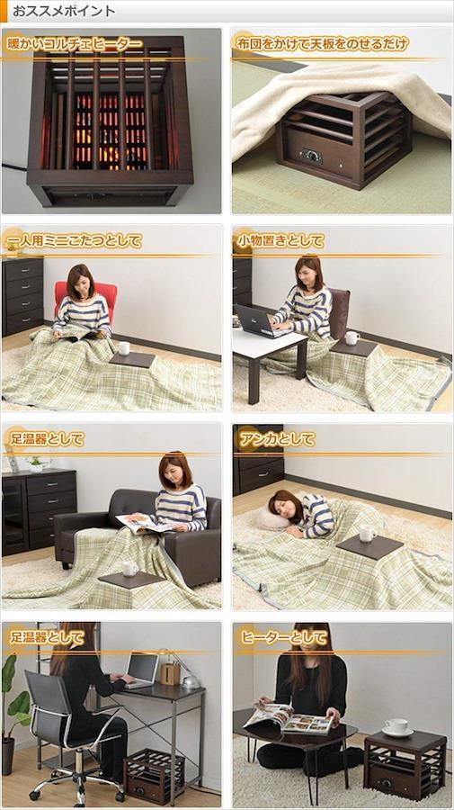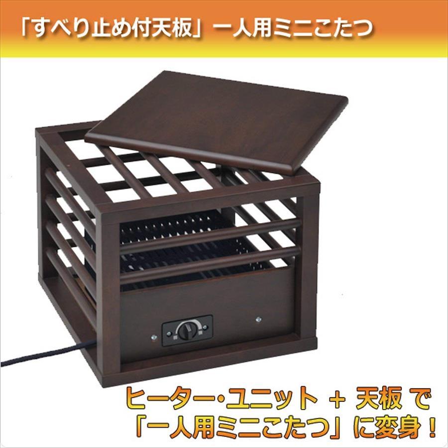 3営業日以内に発送≪新品未開封品≫:●コンパクトで手軽に使える一人用コタツ●滑り落ち防止付きの天板付属●真っ赤な光で、暖かさも明るさもぐんとアップさせたコルチェヒーター●本体には温度ヒューズ、電源コードには電流ヒューズを内蔵し、念には念を入れた二重の安心設計●毛布やブランケットを掛けて手軽に一人用こたつに●机の下でひざ掛けで覆うとフットヒーターに●木枠仕上げで直接ヒーターに触れない安心設計●軽くて持ち運びもらくらく●安全装置:温度ヒューズ●温度制御:サーモスタット●保証期間:お買い上げ日より1年