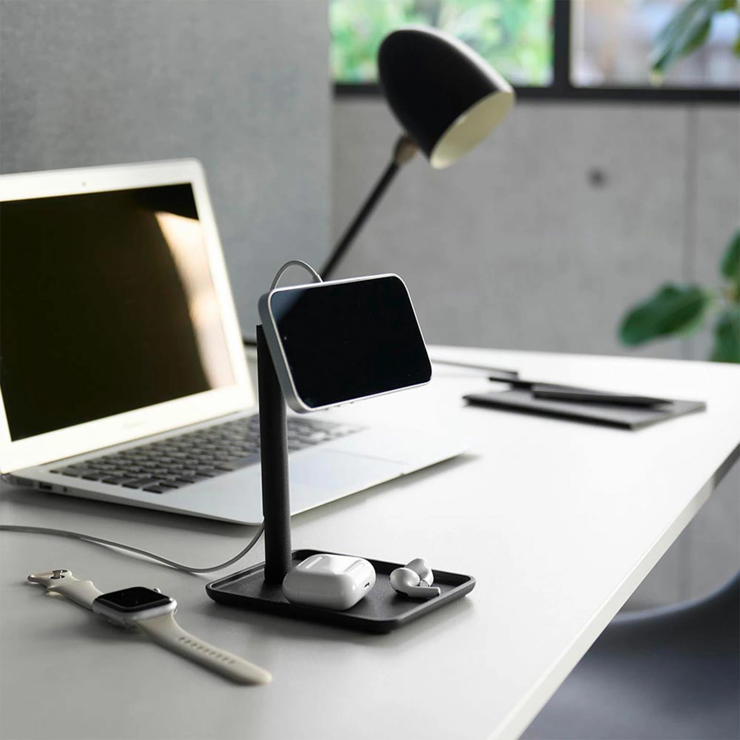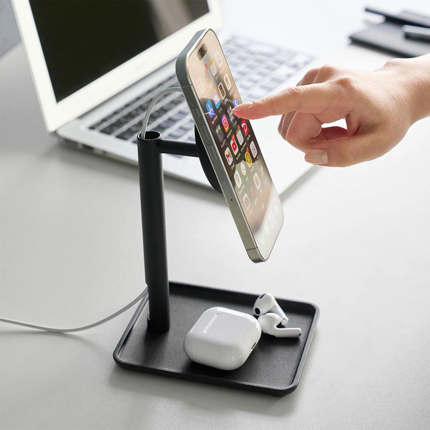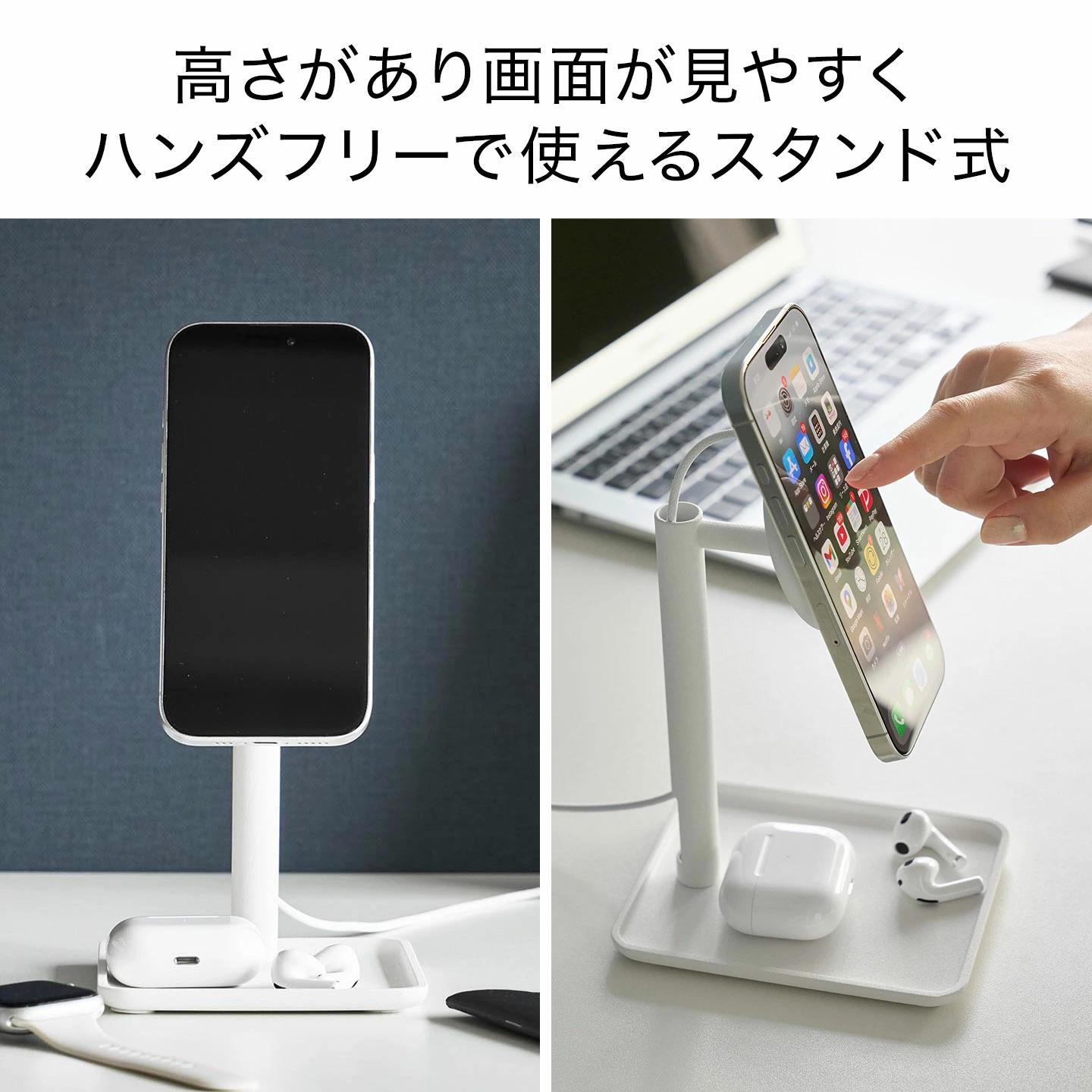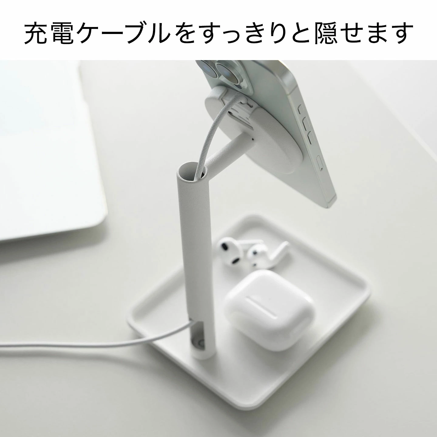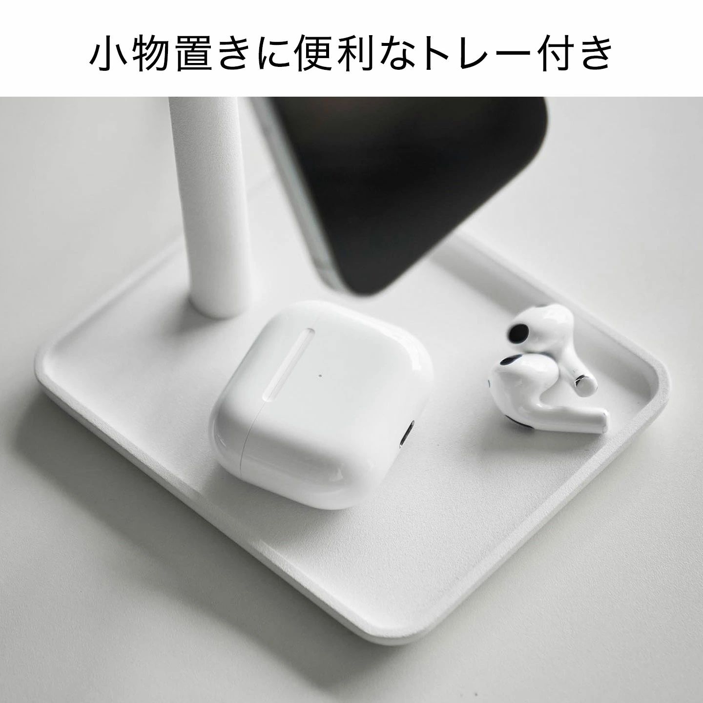 【トレー付きスマートフォン充電スタンド】マグネット式ワイヤレス充電器に対応した、スタイリッシュなトレー付きスマートフォンスタンドです。充電しながらハンズフリーでスマートフォンの操作ができ、充電ケーブルもすっきりと隠せます。トレーには、イヤホンなどの小物も置けて便利。スマートフォンをキズつけにくい、シリコーン製の保護カバー付きです。