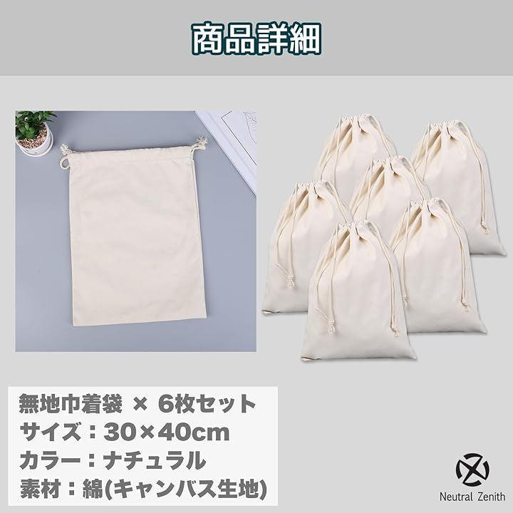 「商品詳細」無地巾着袋 x 6枚セット サイズ:30x40cm カラー:白 (*モニターの環境により、色の見え方に若干差が生じる場合がございます。