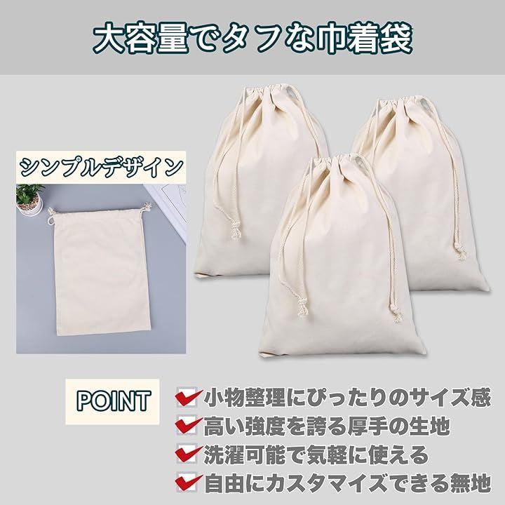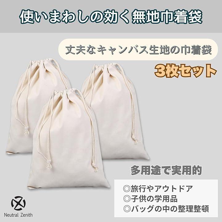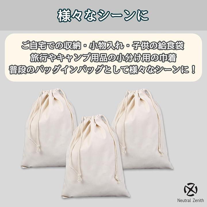「使いまわせる無地コットン巾着」 天然コットンのキャンバス生地を使用した無地巾着袋は、旅行やアウトドア、子供の学用品、バッグの整理など幅広いシーンで活躍します。