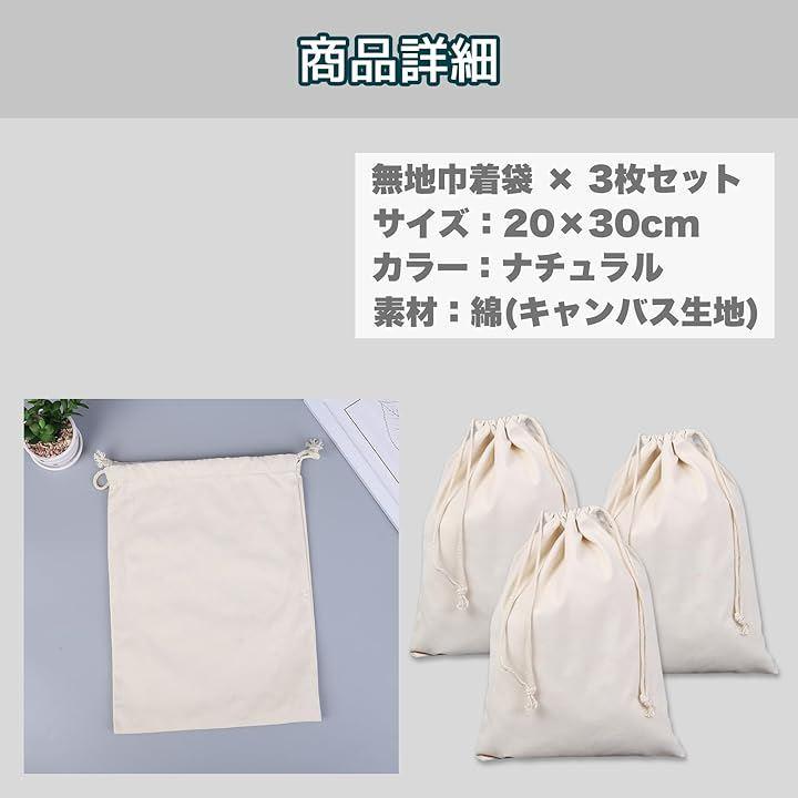 「商品詳細」 *セット内容:無地巾着袋 3枚セット / 無地巾着袋 6枚セット *サイズ:20x30cm / 30x40cm *カラー:ホワイト(*モニター環境により色の見え方に差が生じる場合があります) *素材:コットン・キャンバス生地