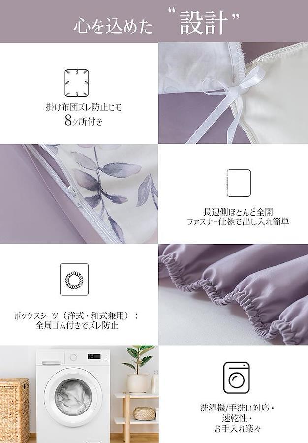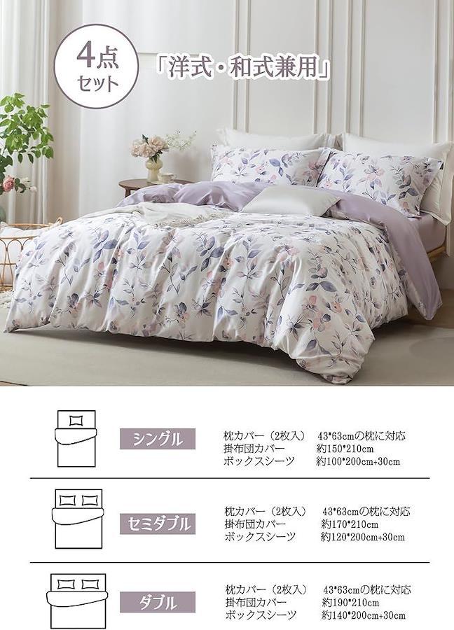 「セット内容詳細」 ・掛け布団カバー:190x210cm(duvet covers) ・マットレスカバー:140x200cm(厚さ30cm対応) ・枕カバー:43x63cmx2枚(エンベロープ式) *サイズは測定方法により±1~2cmの誤差が生じます
