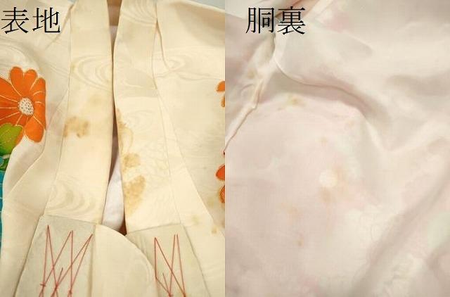 産着【表地:正絹・胴裏:化繊】の状態は接写画像のように表地所々・胴裏所々に薄い汚れがございます。
