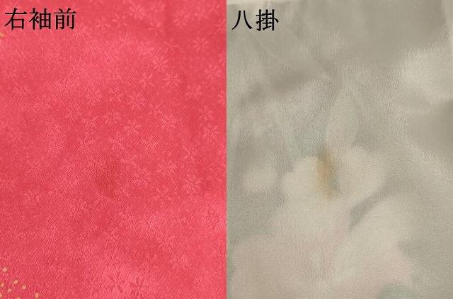 着物【正絹】の状態は接写画像のように右袖前にシミ、八掛に汚れがございますが