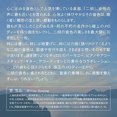 3営業日以内に発送≪新品未開封品≫内容紹介 かつてのアジア・ブームを経て、今もなお日本人の心に沁みる音色として人気を博している楽器、「二胡」。 女性の声に最も近いとも言われる、心地よく伸びやかなその音色は、聴く者に郷愁の念と深い感動をもたらします。 二胡奏者、曹 雪晶が奏でる7年ぶりの新録となる本作は、誰もが耳にしたことのある洋・邦の不朽の名作から、選りすぐりの美メロの曲をセレクトし、二胡の音色の美しさを最大限に引き出した一枚。 時には優しく、時には物憂げに、時には力強く語りかけてくるような二胡の音色は、国境や世代を越え、さまざまな想いをのせて駆け巡ります。 チェロとの美しいハーモニーが涙をさそう、『ニュー・シネマ・パラダイス』より「初恋~愛のテーマ」、「夜明けのスキャット」、 歌の感動がそのままに表現された「糸」、「ハナミズキ」、 アコーディオンやアコースティック・ギターとの素朴なコラボレーションが郷愁を呼び覚ます「青春の影」、「青春の輝き」…、 どの曲も強く心に響いてくる、珠玉のメロディーばかり! 二胡の音色に癒されるとともに、音楽の素晴らしさに感動を覚えずにはいられない、“ヒーリング・ミュージックの
