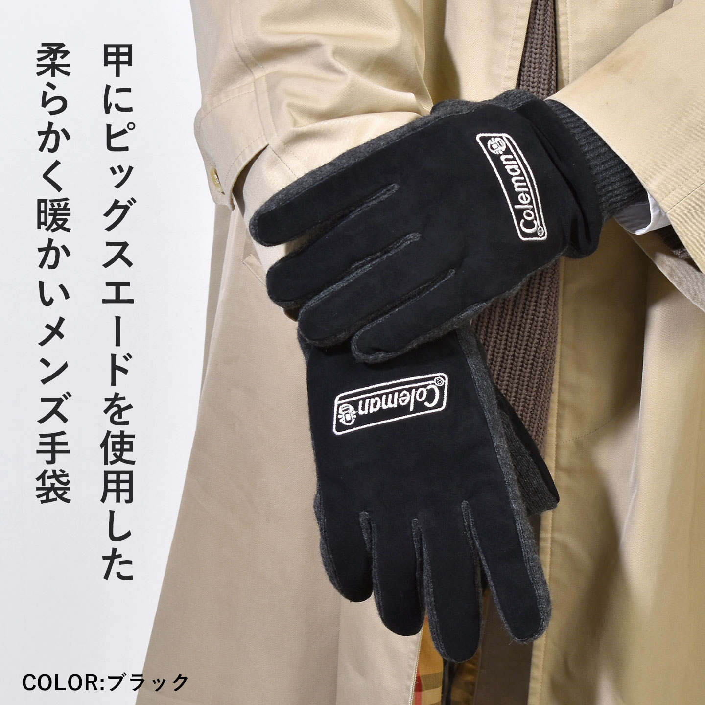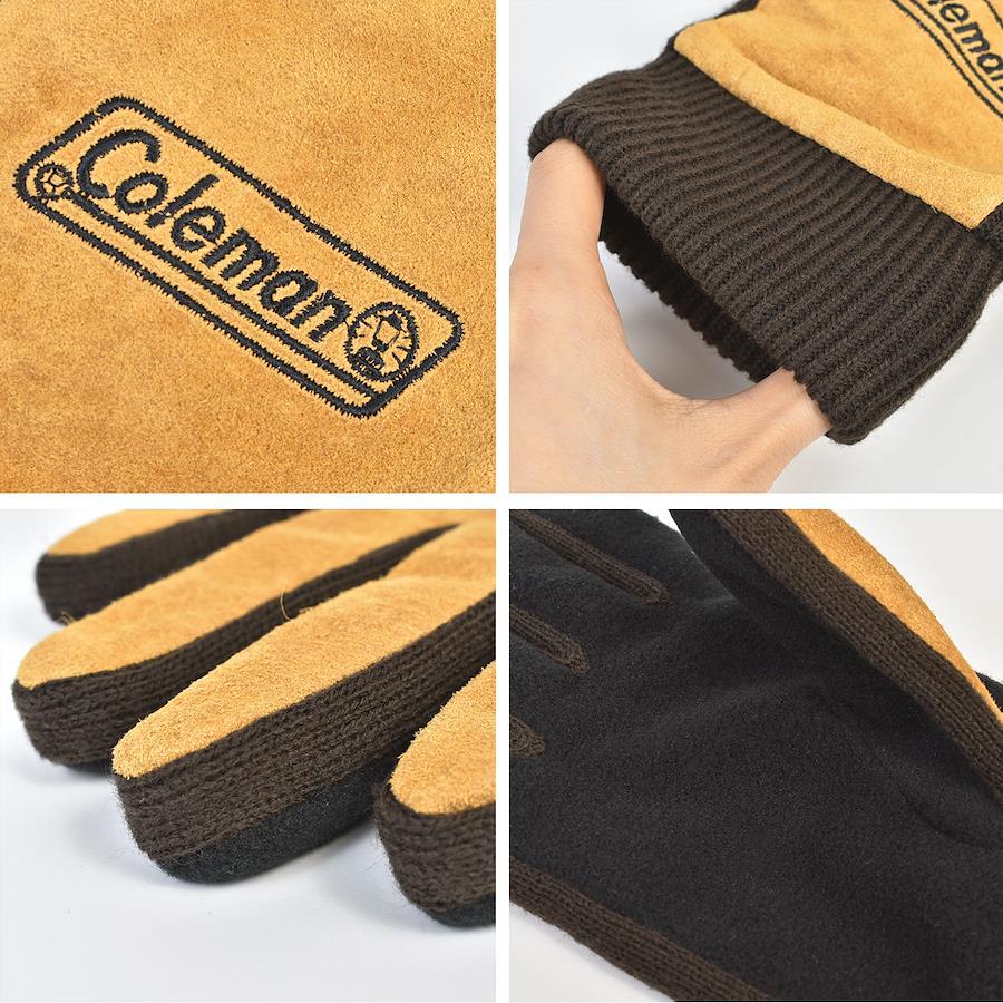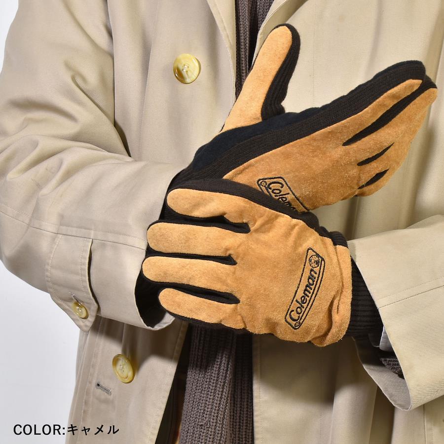 【メンズピッグスエードグローブ】アウトドアブランドColeman(コールマン)のロゴ刺繍がポイントのメンズ手袋。柔らかで風合いのあるピッグスエード(豚革)を甲部分に使用し、手のひらや裏地はフリース素材で暖かく動きやすく仕上げました。アウトドアシーンはもちろん、通勤・通学などのタウンユースにもぴったりのアイテム。冬のプレゼントにも◎
