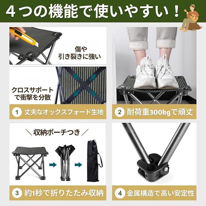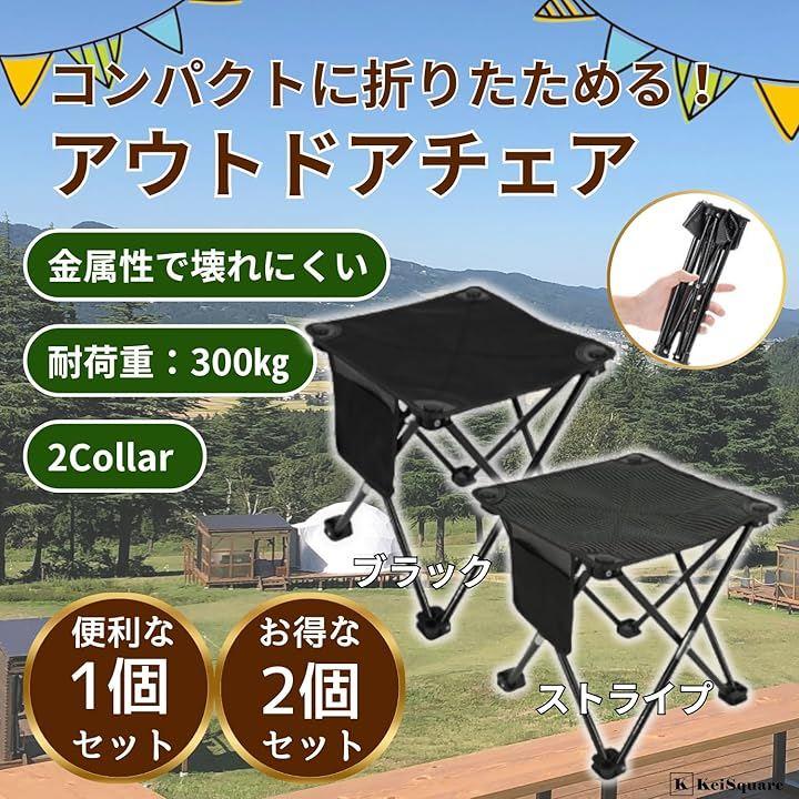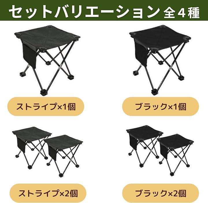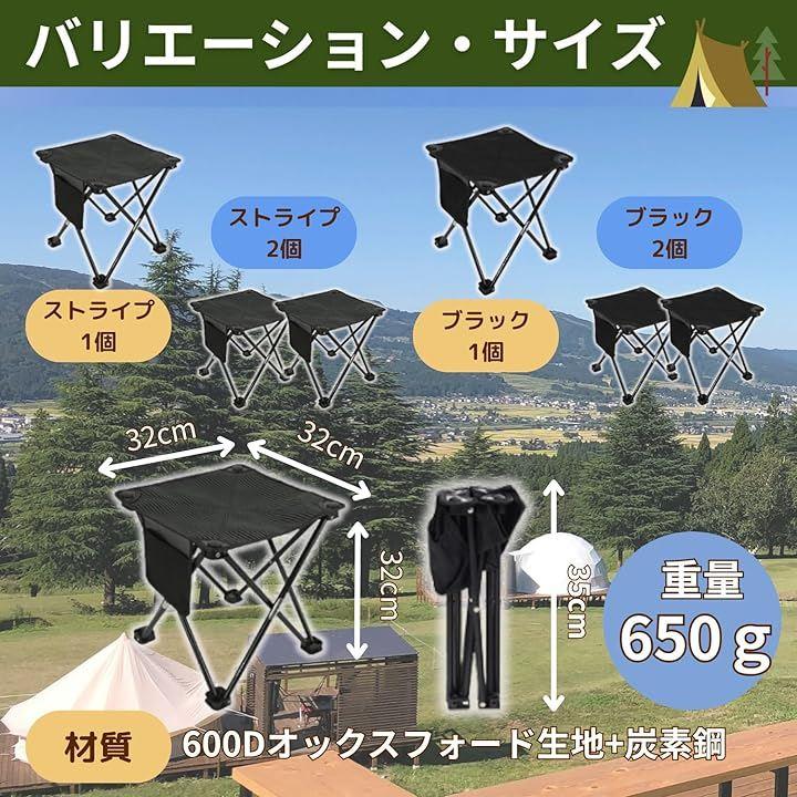 「商品詳細」 ・スタイリッシュなブラック/ストライプ・寸法:座面30cmx30cm、高さ28cm、折りたたみ時37cmx12cm・重量:0.7kg