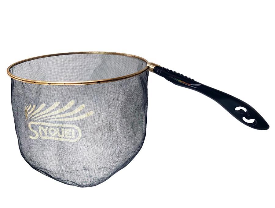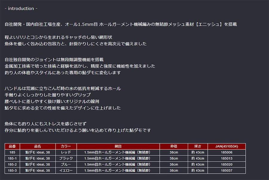 サイズ: 枠径 38cm / 深さ 約43cm / ハンドル長 34cmカラー: ブラック搭載網: オール1.5mm目ホールガーメント機械編の無結節網 (独自メッシュ素材 エニッシュ採用-ロゴデザイン入り)搭載機能:「ステップレスジョイント (無段階角度調整可能/六角レンチ必要)」「アルミ合金フレーム (アルマイト加工)」「仕付け糸用トレンチ (アウトフレームに溝を設ける)」「ABS製 側面形状・ハの字バンプグリップ 全長 34cm」自社生産・日本製 / 品番:【185-1】……「自社開発・国内自社工場生産独自 オール1.5mm目メッシュ網」+「無段階角度調整可能 ステップレスジョイント」+「鮎タモに求める全ての性能を備えたオリジナルハンドル」を採用した、金属加工職人が本気でつくる縁で結ばれた「鮎ダモ」!
