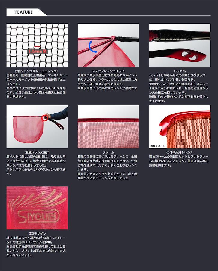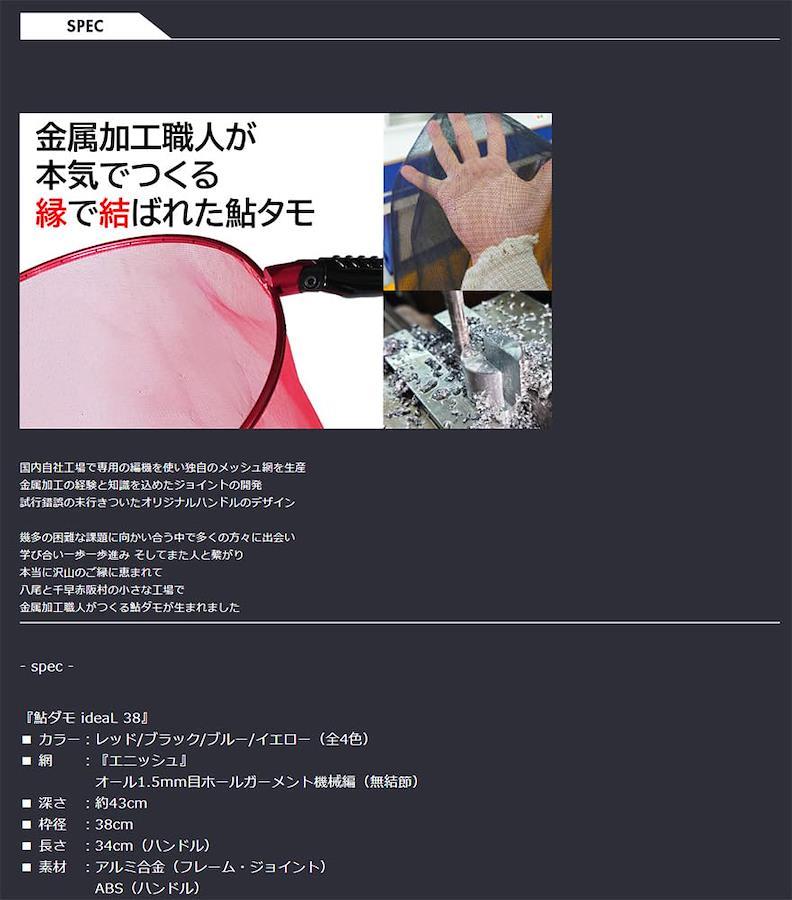 昌栄(Siyouei) 鮎ダモ ideaL 38!!金属加工職人が本気でつくる縁で結ばれた鮎ダモ。国内自社工場で専用の編機を使い独自のメッシュ網を生産金属加工の経験と知識を込めたジョイントの開発試行錯誤の末行きついたオリジナルハンドルのデザイン。幾多の困難な課題に向かい合う中で多くの方々に出会い学び合い一歩一歩進み そしてまた人と繋がり本当に沢山のご縁に恵まれて八尾と千早赤阪村の小さな工場で金属加工職人がつくる鮎タモが生まれました。腰ベルトに差した際の抜け難さ、取り出し易さと操作性の良さ鮎タモの肝である最適なバランス設定を追求しましたオール1.5mm目の独自開発メッシュ『エニッシュ』の採用により魚体のヌメリの取れにくさと、針掛かりトラブルの低減を両立人にも魚にもストレスない心地の良い釣りをお楽しみください。