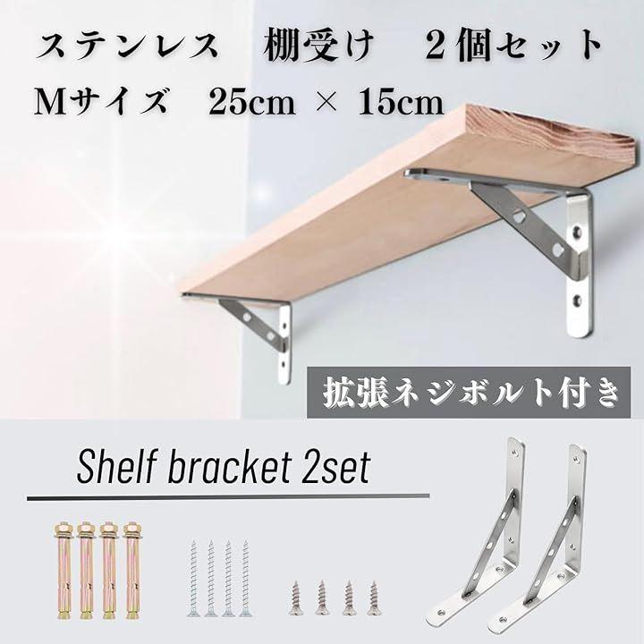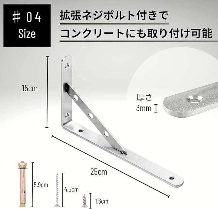 Sサイズ:20cm x 14cm Mサイズ:25cm x 15cm Lサイズ:30cm x 16cm 各サイズ厚み:3mm 付属ビスの1.6cmビスは棚板の固定に、4.5cmビス、拡張ネジボルトは壁との固定にご使用ください。