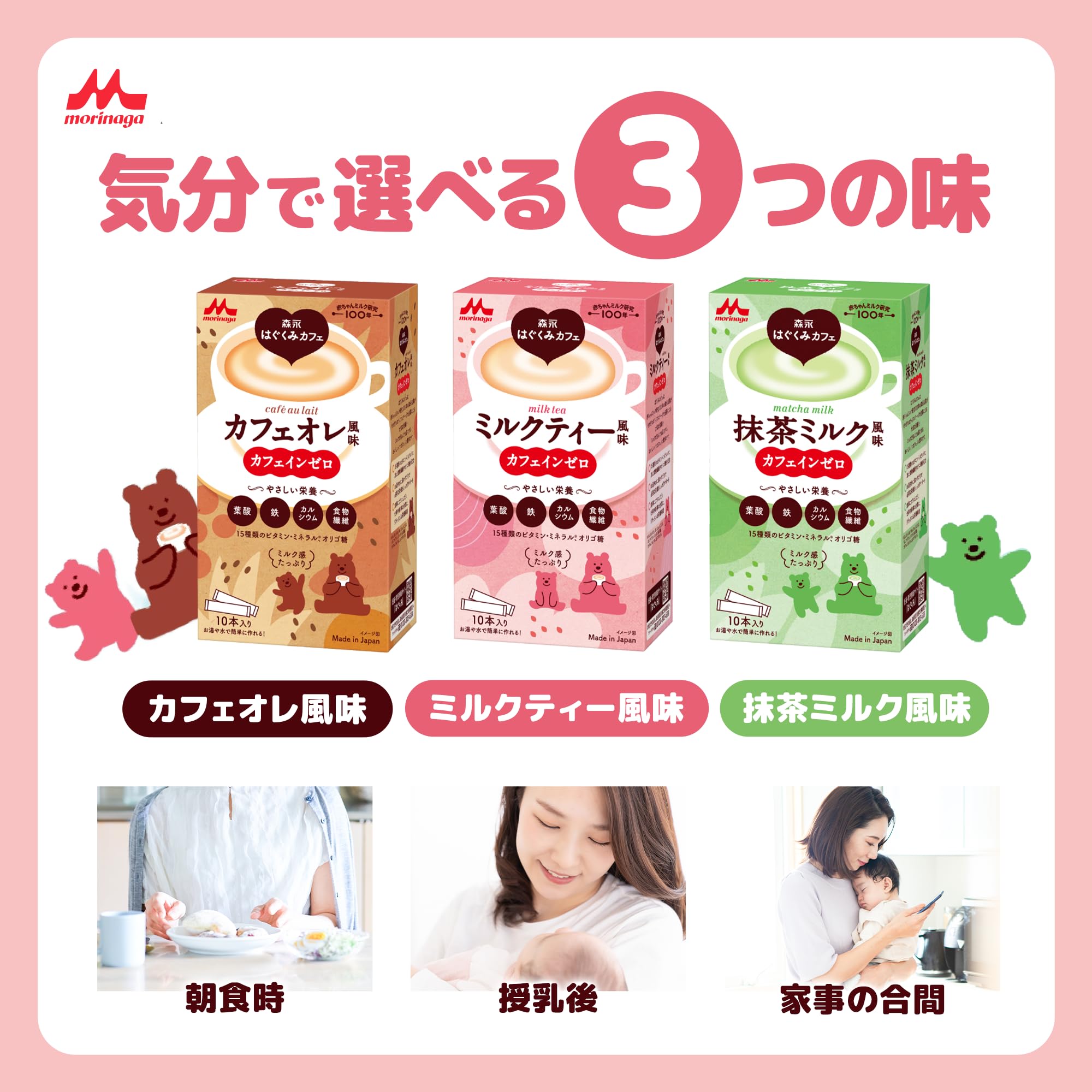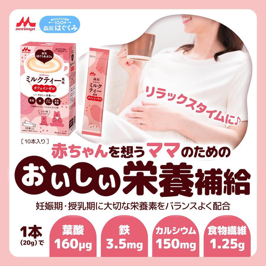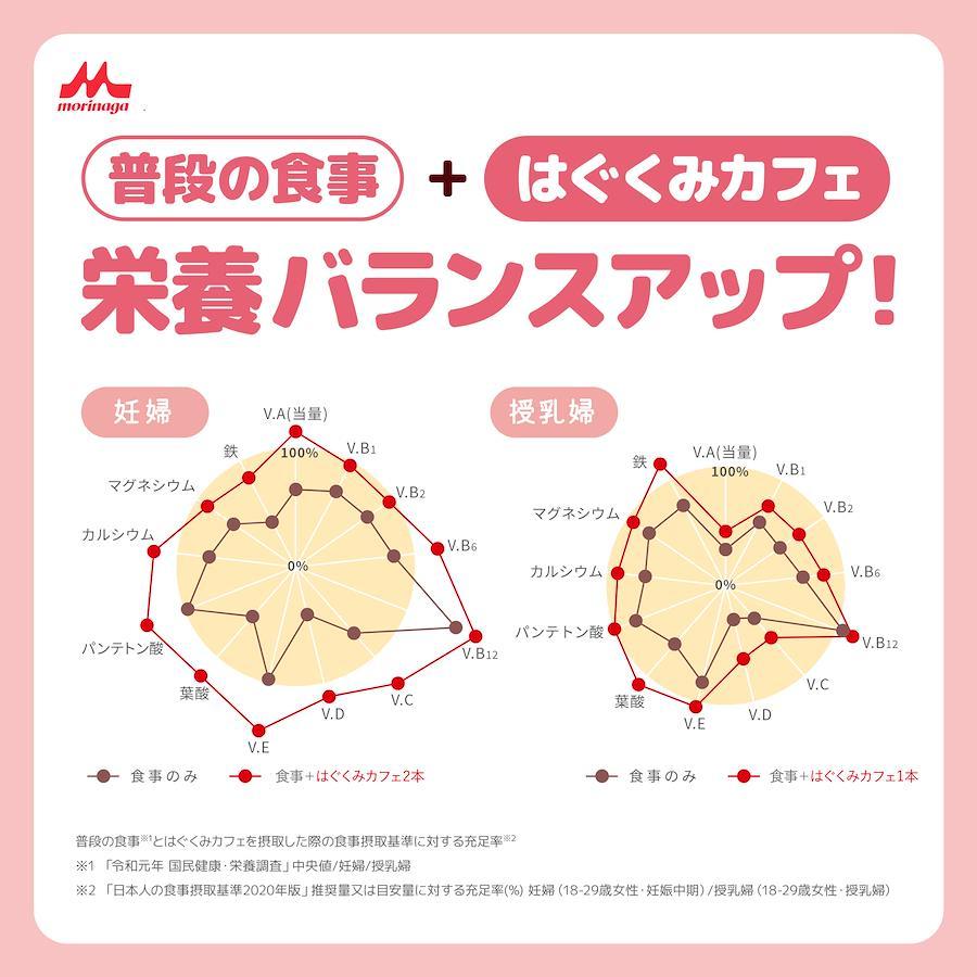 【森永 はぐくみカフェシリーズ】妊娠、授乳期に大切な栄養成分をバランスよく配合したママ用ミルクです。 【お母さんのやさしさを赤ちゃんに】カフェインゼロのママ用ミルク。ホットで飲めるから体も温まります。妊娠中は食事に2本プラスするだけ。 【毎日摂りたい葉酸】葉酸は、胎児の発育や安定した妊娠期を過ごすためにとても重要です。『はぐくみカフェ』では、1日1本で、ほうれん草約5株分(1株=30g茹で)の葉酸が摂取できます。 【不足しがちな鉄分】妊娠中にも大切な鉄分。不足すると鉄欠乏性貧血が心配です。『はぐくみカフェ』では、1日1本で、焼き鳥レバー約1.3本分(1本=30g)の鉄分が摂取できます。手軽においしく鉄分を採りましょう。 【牛乳が苦手なママにも】カルシウムは、鉄分と並んで多くの女性が不足している栄養素です。『はぐくみカフェ』では、1日1本で、牛乳コップ1杯弱分(1杯=140ml)のカルシウムが摂取できます。【免責事項】メーカーによる商品リニューアルに伴いパッケージ(内容量も含む)変更が行われた場合、新パッケージでお届け致します事ご了承願います。