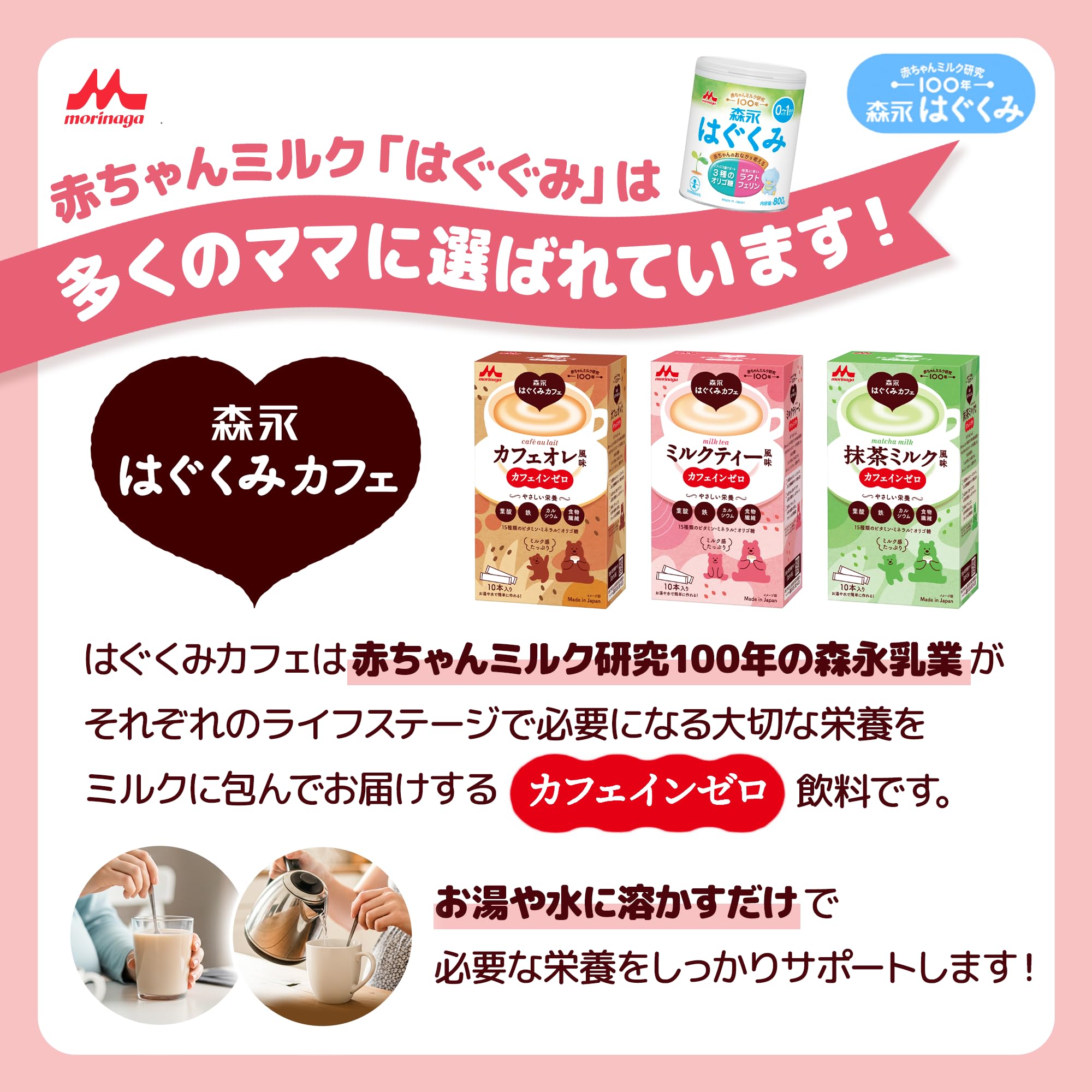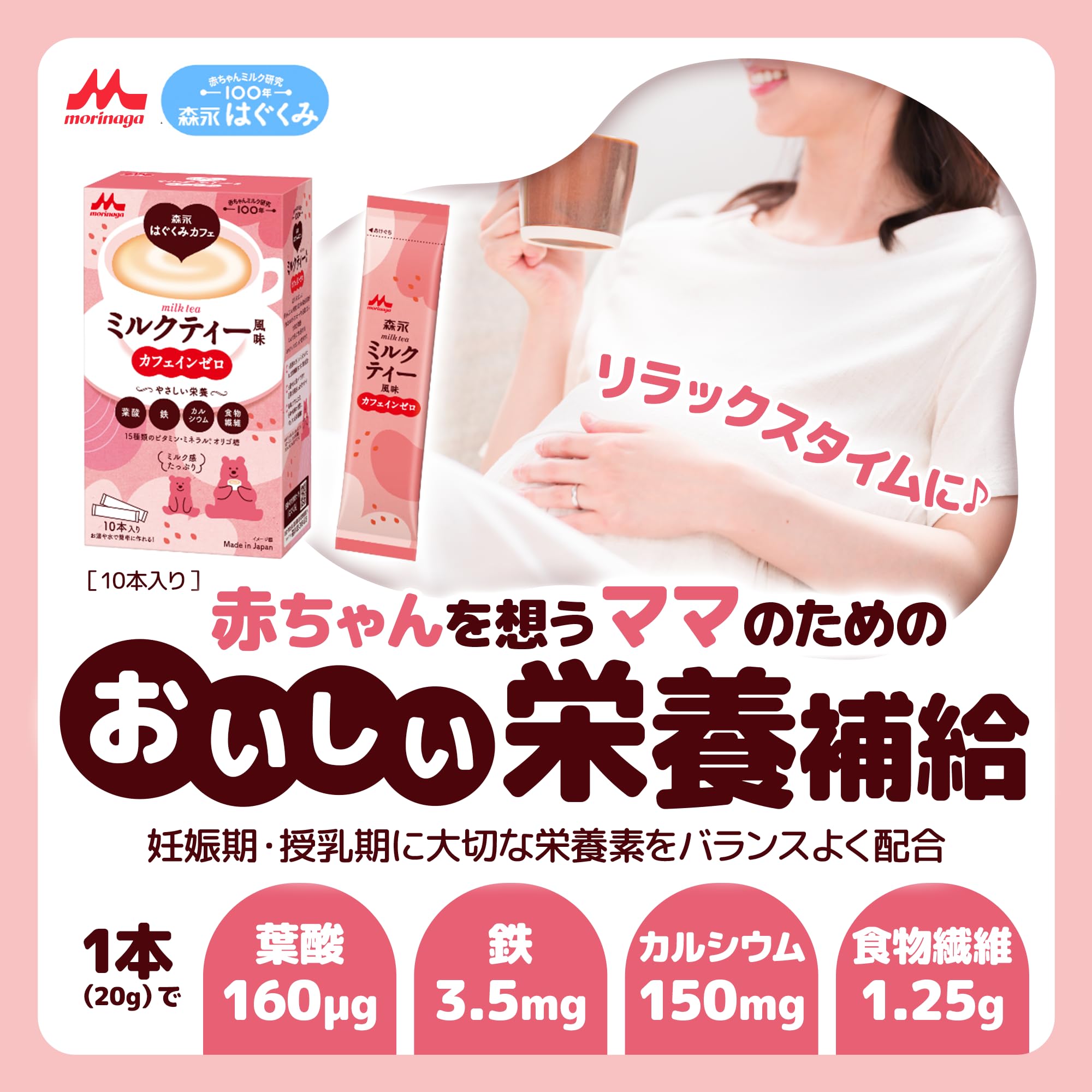 【森永 はぐくみカフェシリーズ】妊娠、授乳期に大切な栄養成分をバランスよく配合したママ用ミルクです。 【お母さんのやさしさを赤ちゃんに】カフェインゼロのママ用ミルク。ホットで飲めるから体も温まります。妊娠中は食事に2本プラスするだけ。 【毎日摂りたい葉酸】葉酸は、胎児の発育や安定した妊娠期を過ごすためにとても重要です。『はぐくみカフェ』では、1日1本で、ほうれん草約5株分(1株=30g茹で)の葉酸が摂取できます。 【不足しがちな鉄分】妊娠中にも大切な鉄分。不足すると鉄欠乏性貧血が心配です。『はぐくみカフェ』では、1日1本で、焼き鳥レバー約1.3本分(1本=30g)の鉄分が摂取できます。手軽においしく鉄分を採りましょう。 【牛乳が苦手なママにも】カルシウムは、鉄分と並んで多くの女性が不足している栄養素です。『はぐくみカフェ』では、1日1本で、牛乳コップ1杯弱分(1杯=140ml)のカルシウムが摂取できます。【免責事項】メーカーによる商品リニューアルに伴いパッケージ(内容量も含む)変更が行われた場合、新パッケージでお届け致します事ご了承願います。