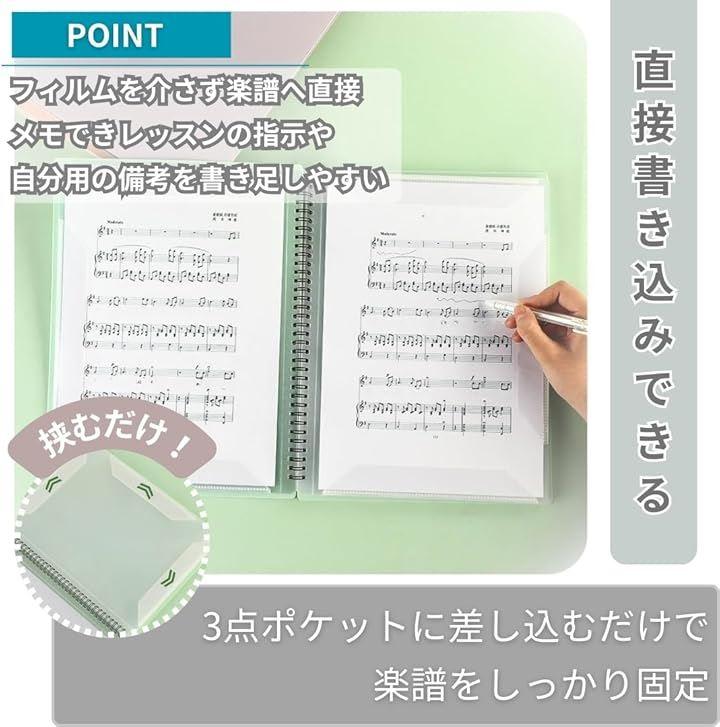 「直接書き込み」3点ポケットに差し込むだけで楽譜をしっかり固定。