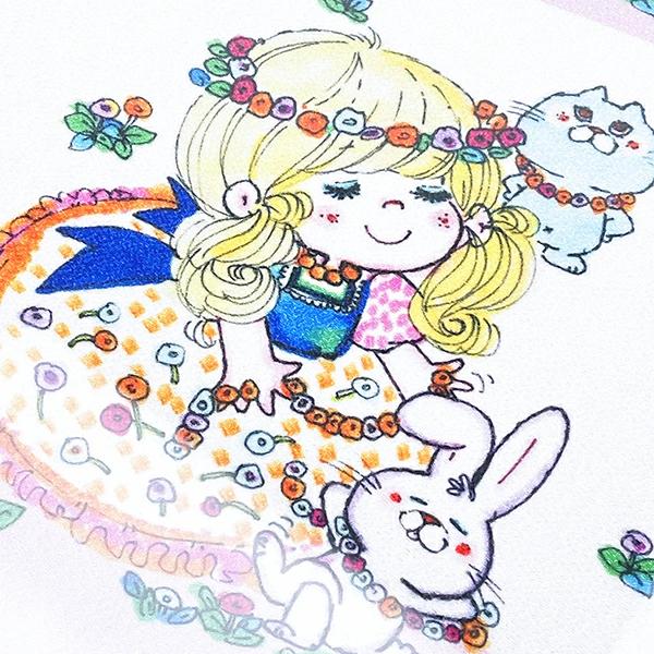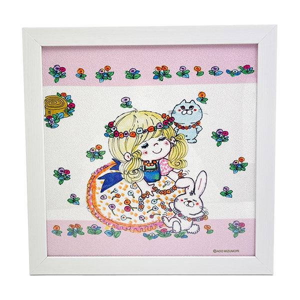 水森亜土のイラストが描かれたちりめん生地を白い額縁に入れた、インテリアにピッタリな額装です。亜土ちゃんの優しい世界観をお家でも楽しんでくださいね♪