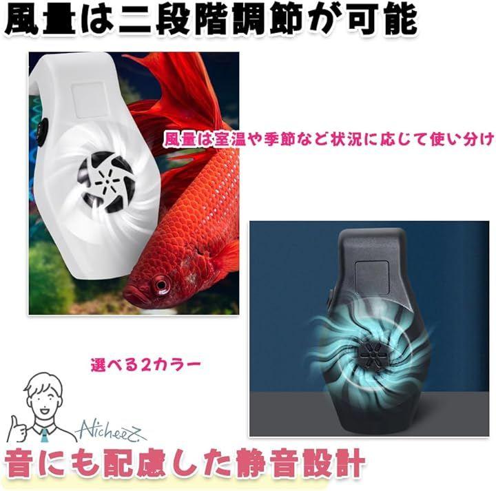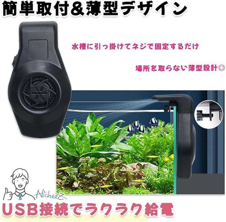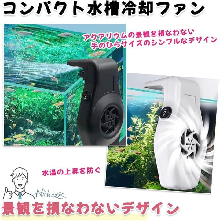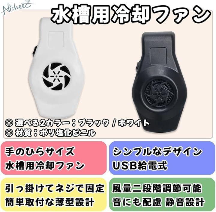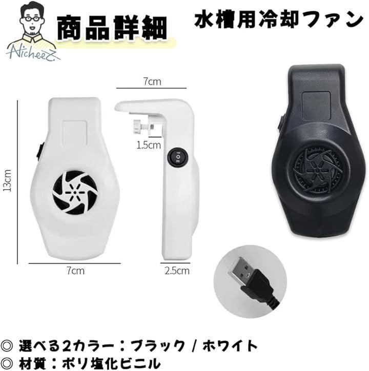 「商品内容」 水槽用冷却ファン 材質:ポリ塩化ビニル カラー:ブラック/ホワイト サイズ:縦/約13cm 横/約7cm 厚さ/約2.5cm 取付部/約1.5cm *USB給電式