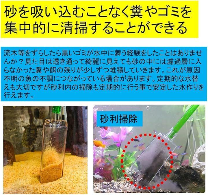 「砂利掃除ノズル:砂を吸い込むことなく糞やゴミを集中的に清掃することができる」 流木等をずらしたら黒いゴミが水中に舞う経験をしたことはありませんか?見た目は透き通って綺麗に見えても砂の中には濾過層に入らなかった糞や餌の残りが少しずつ堆積していきます。
