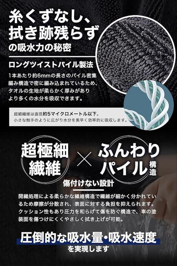 通常のタオルより5倍、一般的マイクロファイバー(片面)より2倍の吸水性が優れており、洗車時間を半分まで短縮できます。