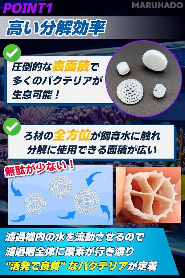 ・「特徴」流動濾過材とはMBBR(Moving bed biofilm reactor, 高効率流動床式生物膜担体処理)を用いた濾過材で、表面に生物膜を形成させ流動させることにより水中の有機物やアンモニア等の有害物質を効率よく分解できるアクアリスト必見アイテムです。