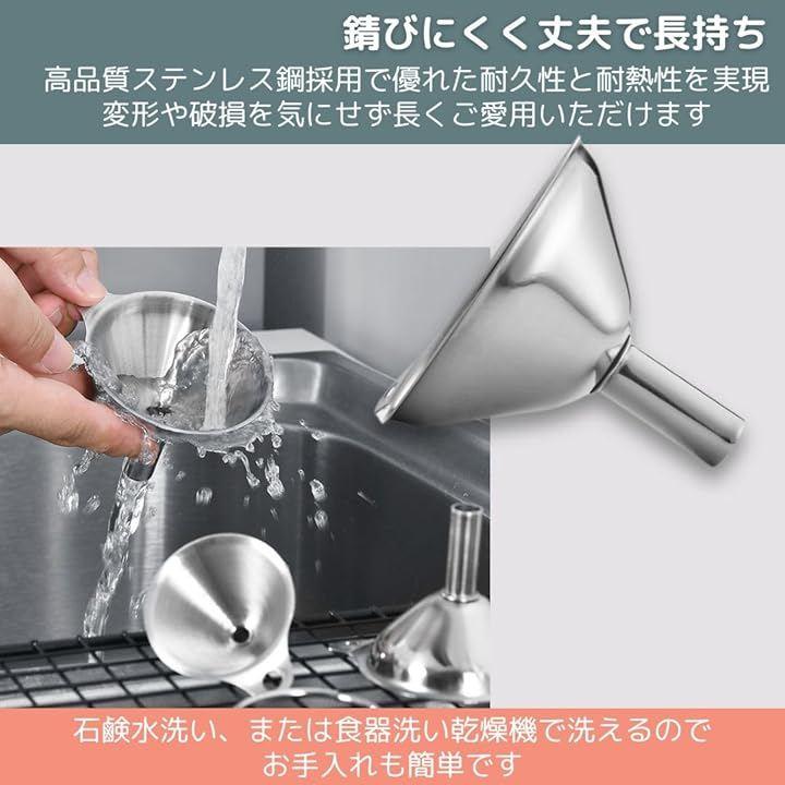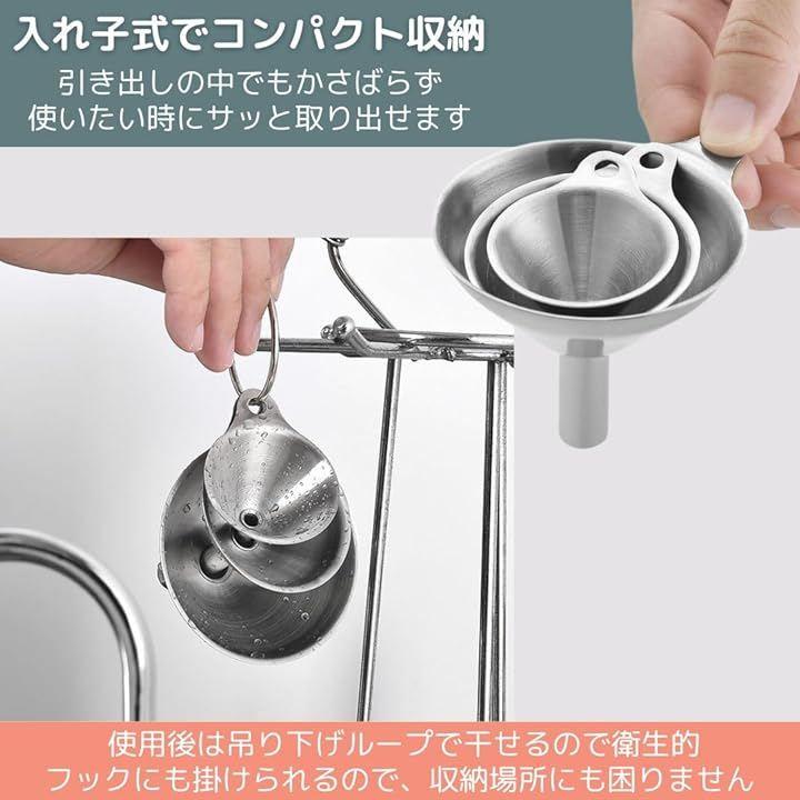 「商品詳細」セット内容:漏斗3個セット サイズ:直径7.5cm x 高さ6.5cm / 直径5.5cm x 高さ5cm / 直径4.5cm x 高さ3.7cm 材質:ステンレス