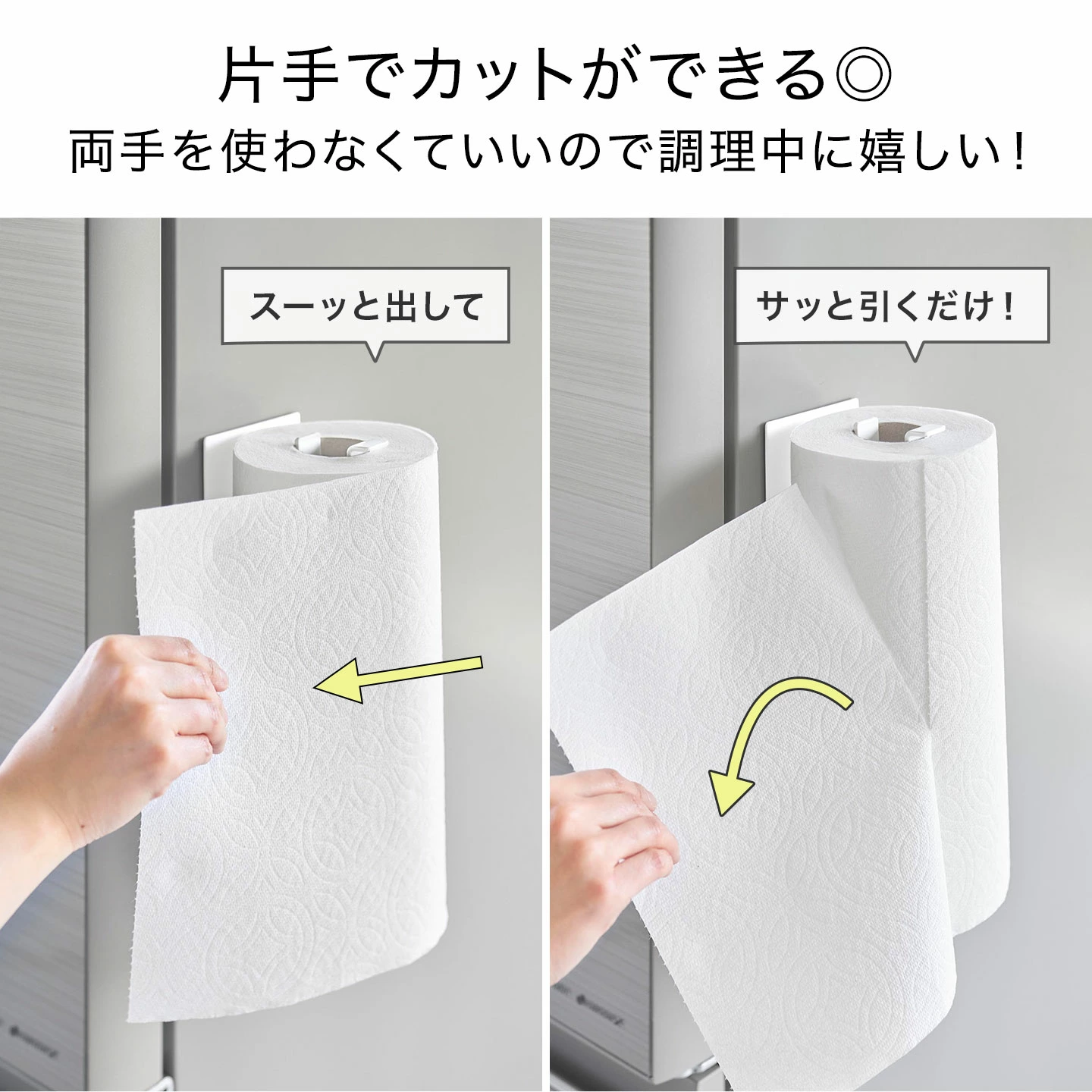 【片手でカットマグネットキッチンペーパーホルダー 縦タイプ L】マグネットで簡単取り付け!片手でカットできるLサイズのキッチンペーパーホルダーです。縦向き、横向きのどちらでも使用可能で、海外製の大判タイプにも対応。差し込むだけのシンプルな構造で使いやすく便利です。シリコーン製のストッパーがキッチンペーパーロールをしっかりキャッチし、スムーズにカットできます。キッチンパネルに設置すれば、野菜の水切りや台拭き、油汚れなどの拭き掃除の際にも便利。