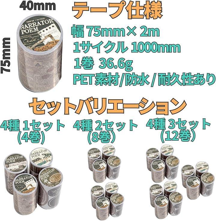 「商品仕様」約70mmxx2m 1セット4種 1種3デザイン、サイズ50mmx2m(ループは約1000mm)「バリエーション」1セット4巻、2セット8巻、3セット12巻 「素材」白ハトロン紙