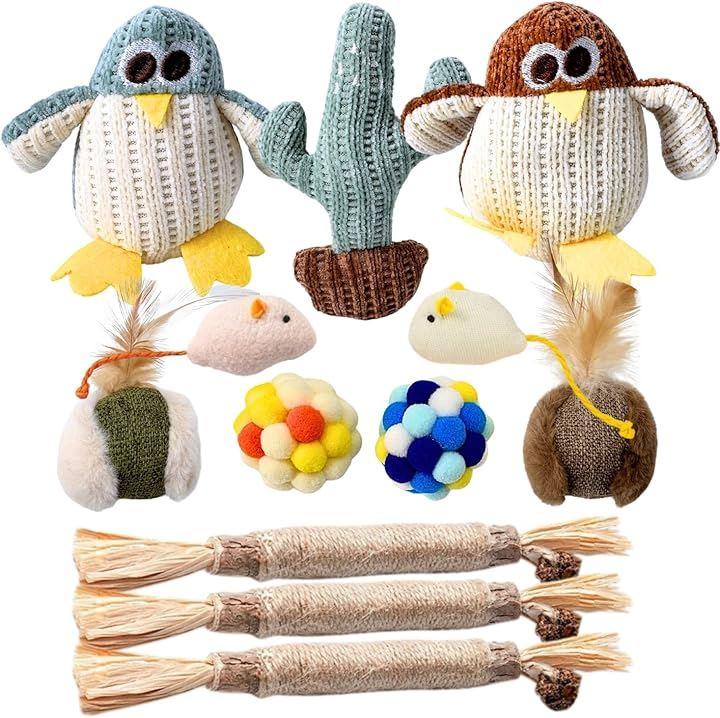 セット内容は、またたび入りのペンギン&サボテンのおもちゃ、カラフルボール、フワフワの羽付きボール、またたび入りの愛らしいネズミのおもちゃ、天然素材100%の噛み噛み棒が含まれています。