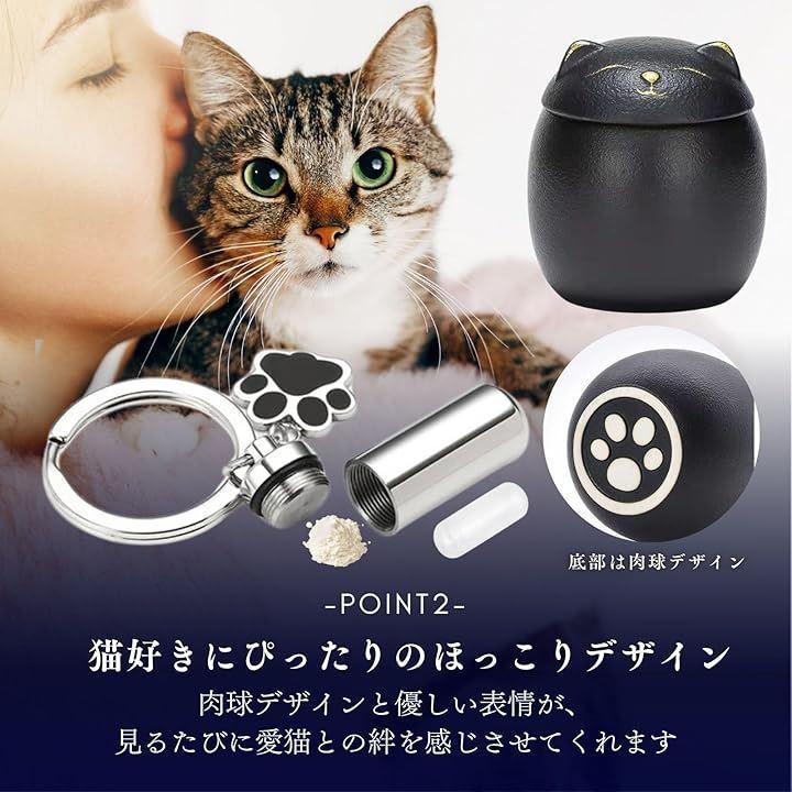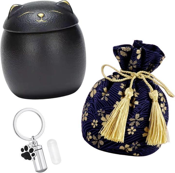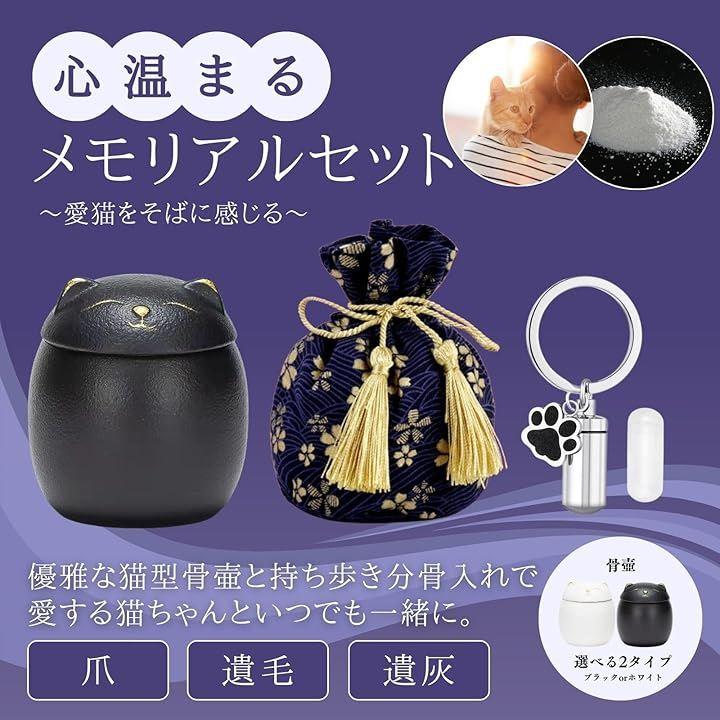 サイズとセット内容:猫 骨壷x1(高さ8.2cm 幅7.3cm 容量200ml)、保護袋x1(高さ13cm 底部の幅9.9cm)、キーホルダー型の遺骨入れx1(分骨入れ高さ2.8cm 幅1.1cm 上部リング直径2.5cm) 骨壷は、白猫と黒猫の2週類からお選びいただけます。