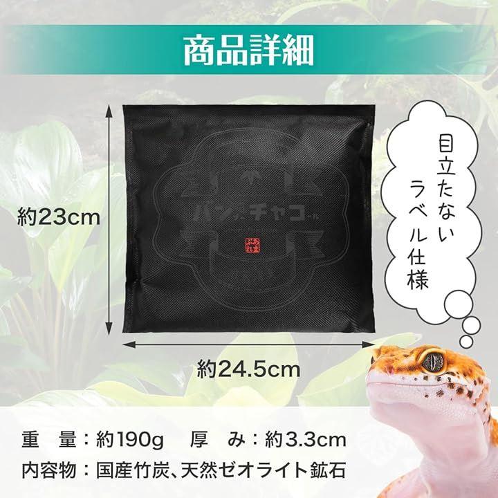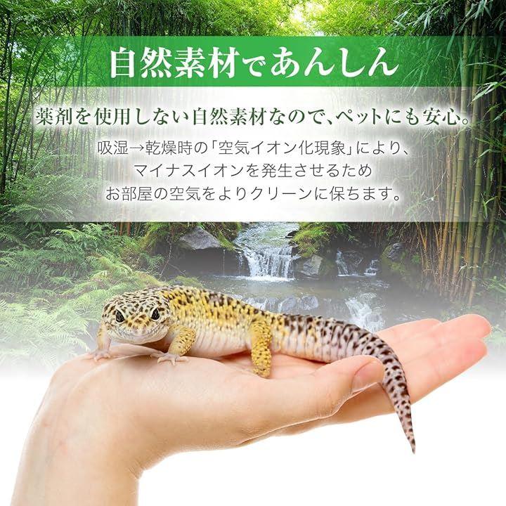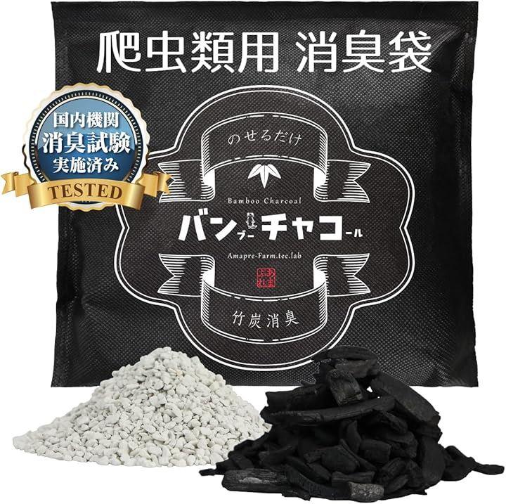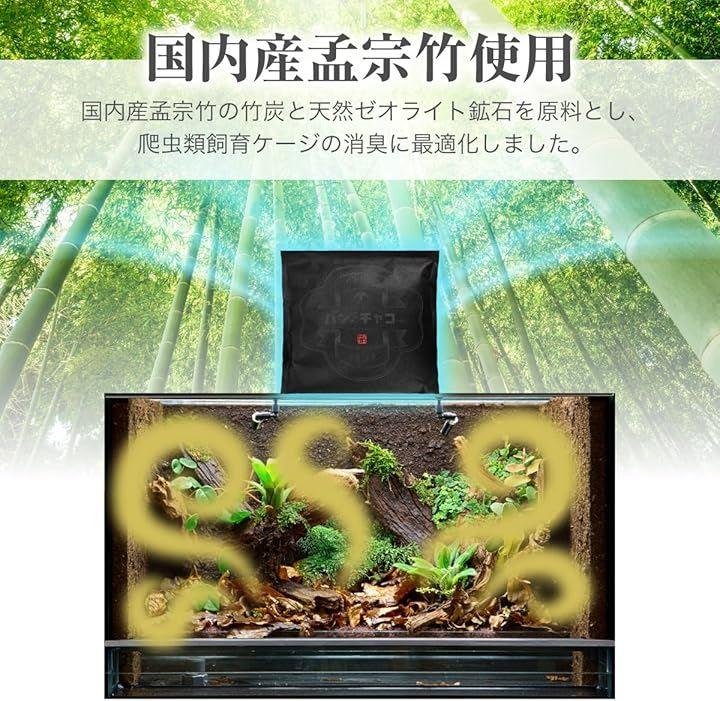 「爬虫類飼育ケージの消臭に特化した原料を使用」 原料の竹炭は国内産孟宗竹を使用し、高温炭化させた消臭力の高い竹炭です。