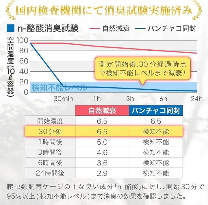 爬虫類飼育ケージの主な臭い成分「n-酪酸」に対し、開始30分で95%以上(検知不能レベル)まで消臭の効果を確認しました。