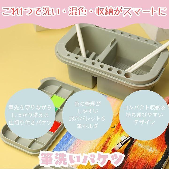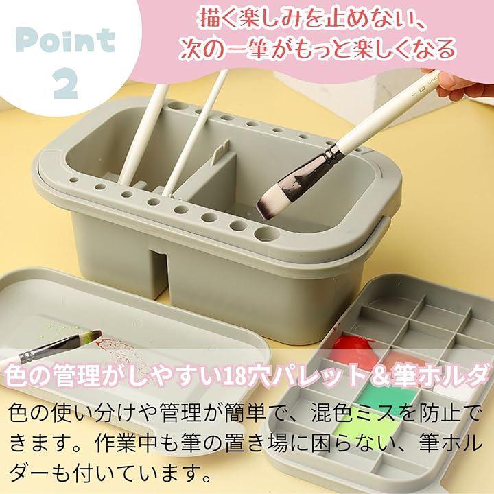 「色の管理がしやすい18穴パレット&筆ホルダ」複数の絵の具をすっきり分けて配置でき、混色ミスを防止。