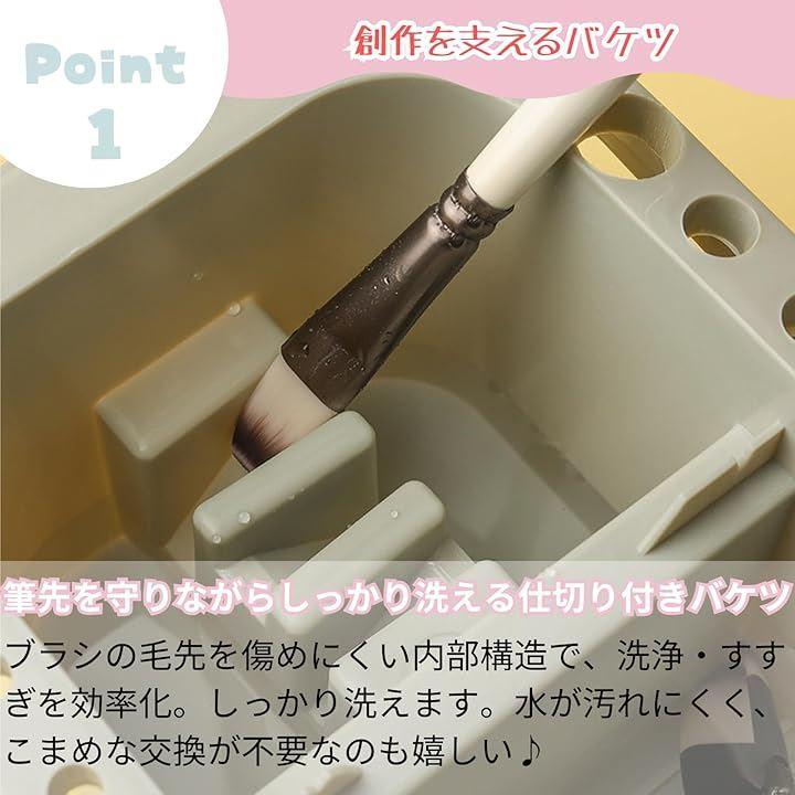 「筆先を守りながらしっかり洗える仕切り付きバケツ」ブラシの毛先を傷めにくい内部構造で、洗浄・すすぎを効率化。