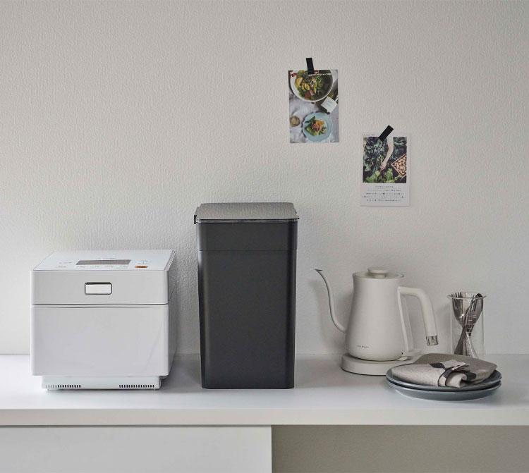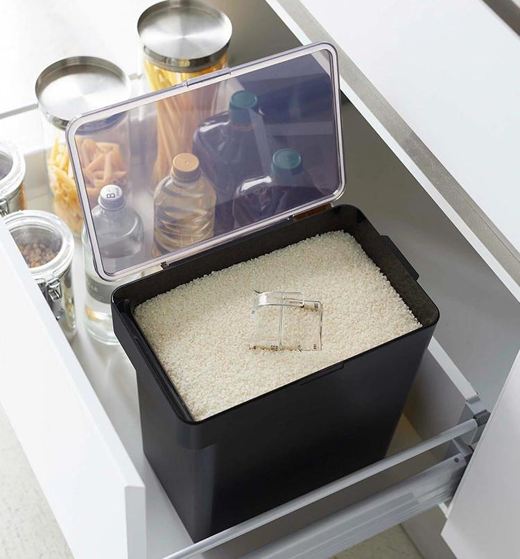 【密閉米びつ 10kg 計量カップ付き】システムキッチンの引き出しに合うスタイリッシュなtowerの10kg用密閉米びつ。パッキンでしっかり密閉され、お米を湿気と酸化から防いでくれます。フタは全面開くのでお米がすくいやすい◎底の形が付属の計量カップにピッタリとフィットするから、残りのお米をきれいにすくい取れる嬉しい設計です。米びつとしてだけでなく、ペットフードの保存容器にも便利ですよ。