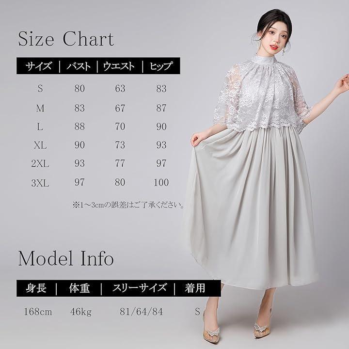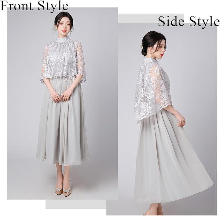 「異素材MIXの華やかなパーティドレス」 このドレスは、優美なレースが織り成すケープ状のトップスと、フワッとエレガントに広がるスカートが特徴の2ピース風ワンピースです。