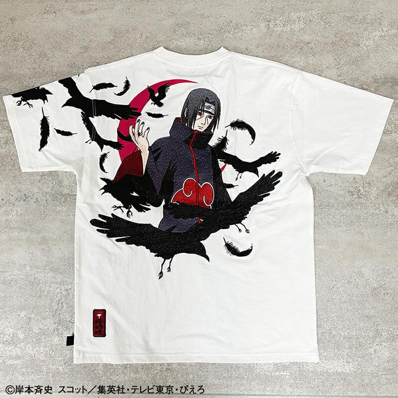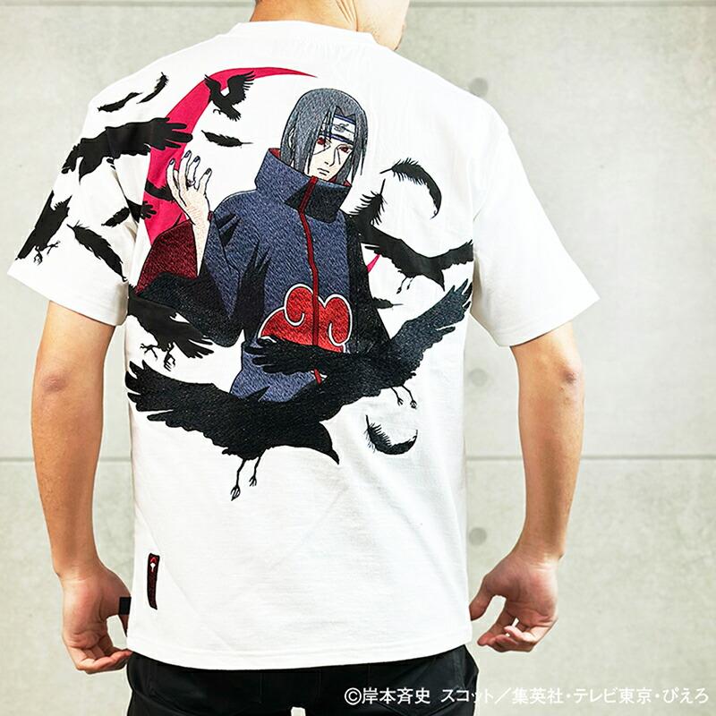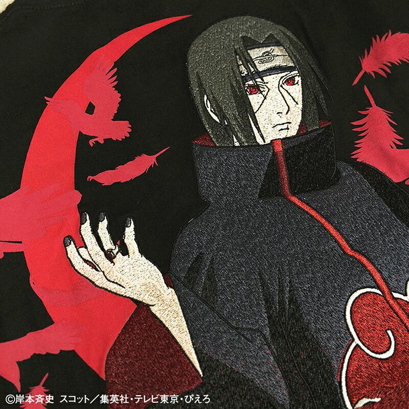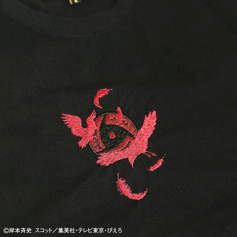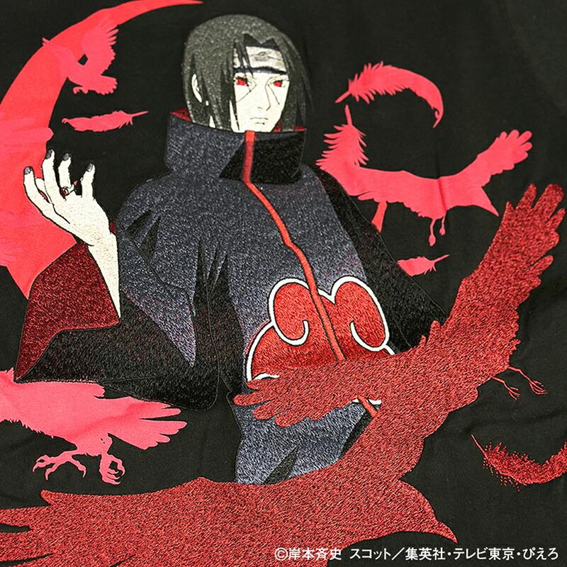 【デザイン】絡繰魂 × NARUTOとのコラボデザインの登場です。うちはイタチ 暁 柄 刺繍 半袖 Tシャツです。遂に世界的大人気テレビアニメ『NARUTO- ナルト- 疾風伝』とのコラボが実現 !!コラボ用描き下ろしイラストを元にした、絡繰魂の真髄ともいえるハイクオリティな刺繍は必見 !!「うちはサスケ」の兄である謎めいた男「うちはイタチ」と、口寄せしたカラス達を刺繍 !!赤い月を背景に佇む姿と「写輪眼」を表現。絡繰魂のロゴ刺繍部分には、うちはの家紋を加えた限定デザイン。全てが、あなたの記憶を呼び起こすようなコラボならではのデザインに仕上げました。
