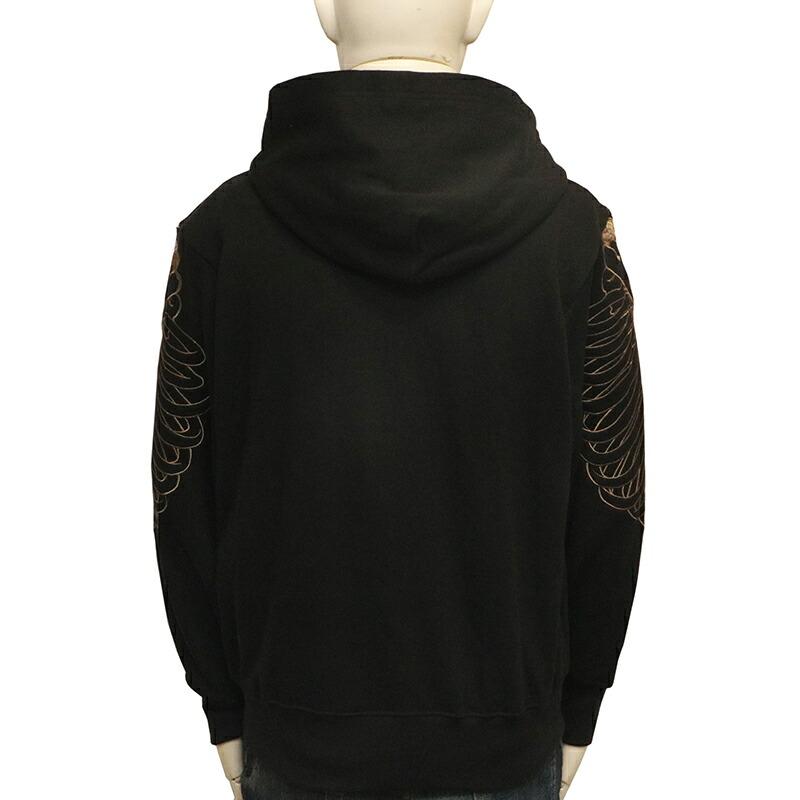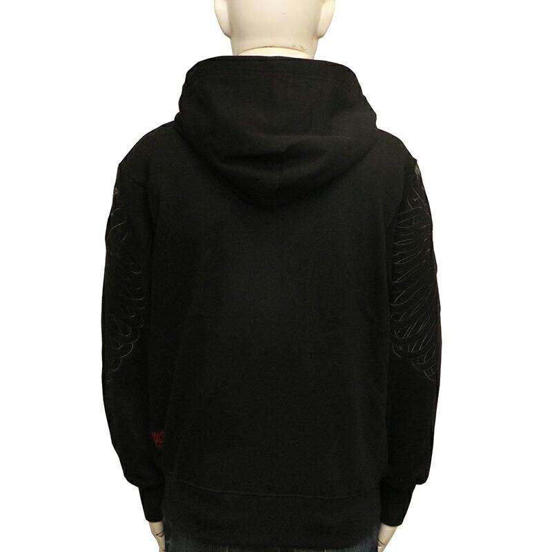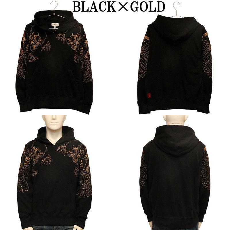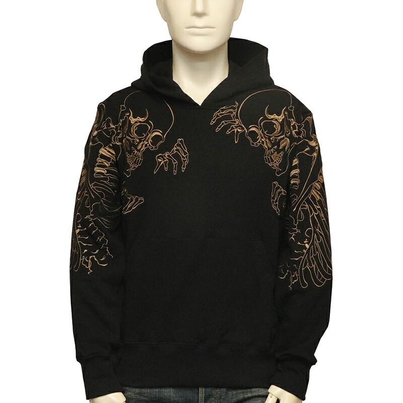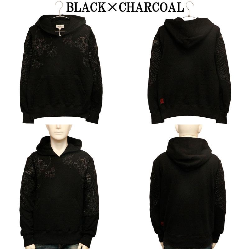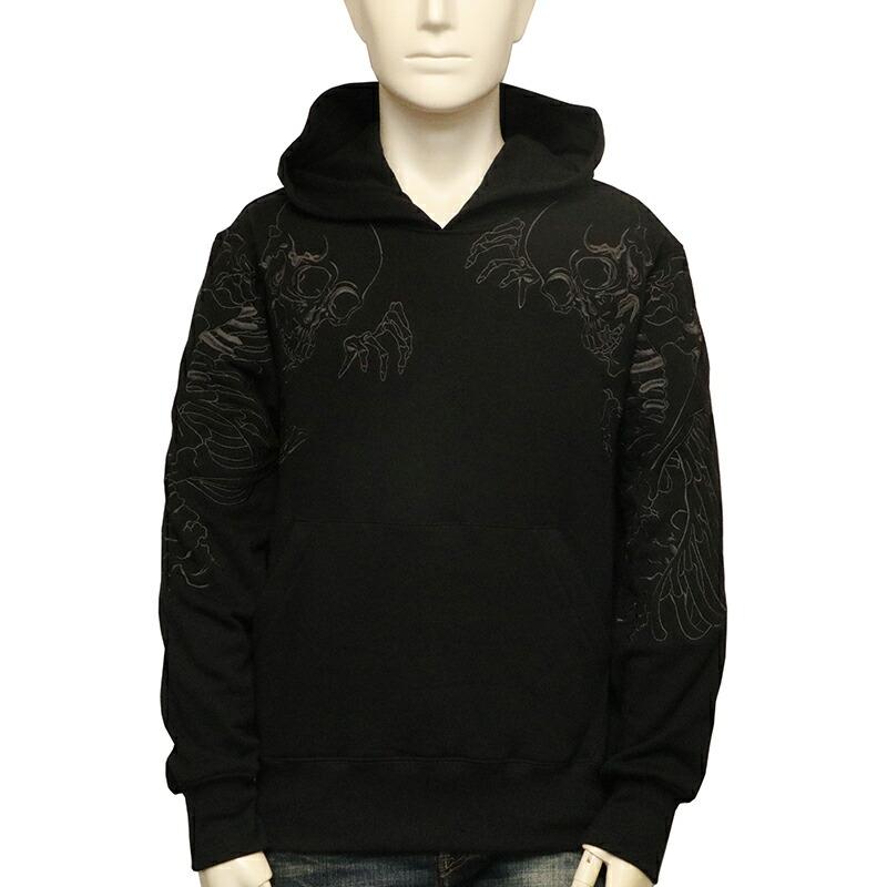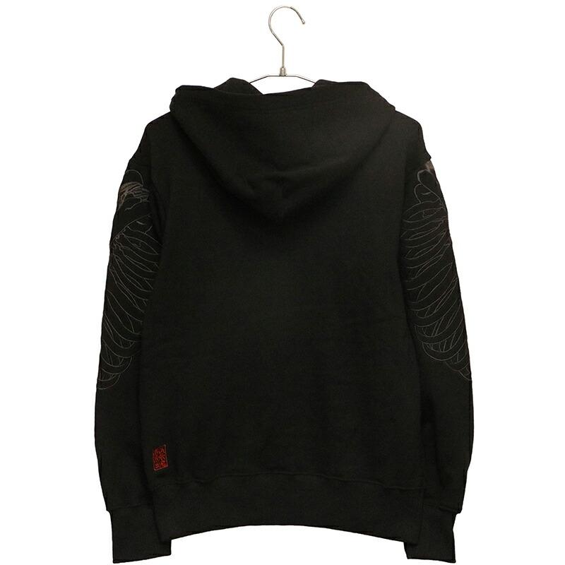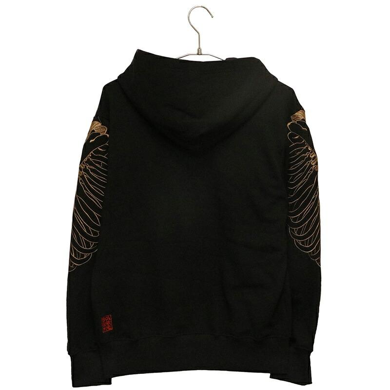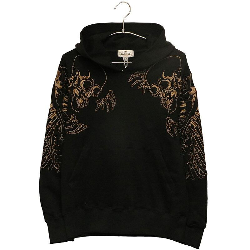 両肩にがしゃ髑髏を刺繍したプルパーカー。