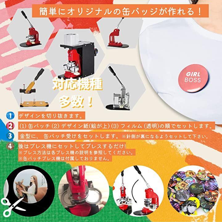「セット内容」: 缶バッジシェルx100、ピンバックx100、バッジフィルムx100
