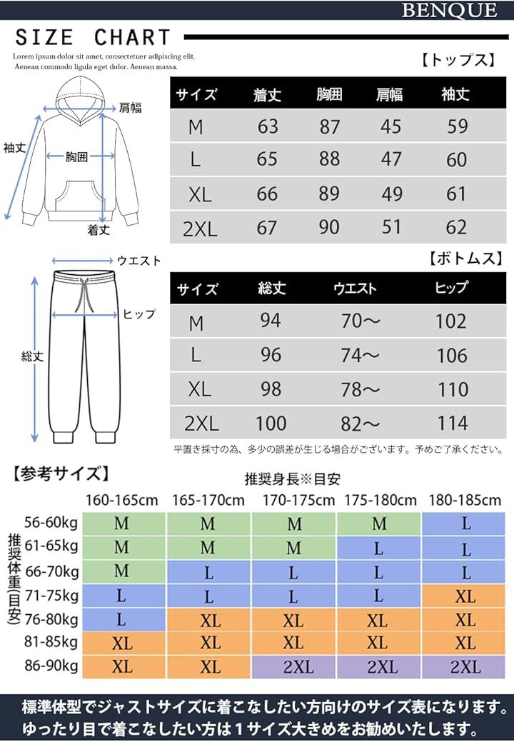 *素材:ポリエステル100% *カラー:ブラック、グレー *サイズ:M,L,XL,2XL,3XL トップス 着丈 /胸囲 /肩幅 /袖丈 [M] : 63 / 87 / 45 / 59 [L] : 65 / 88 / 47 / 60 [XL] :66 / 89 / 49 / 61 [2XL] :67 / 90 / 51 / 62 ボトムス 総丈 /ウエスト(ゴム仕様) /ヒップ [M] : 94 / 70~ / 102 [L] : 96 / 74~ / 106 [XL] :98 / 78~ / 110 [2XL] :100 / 82~ / 114