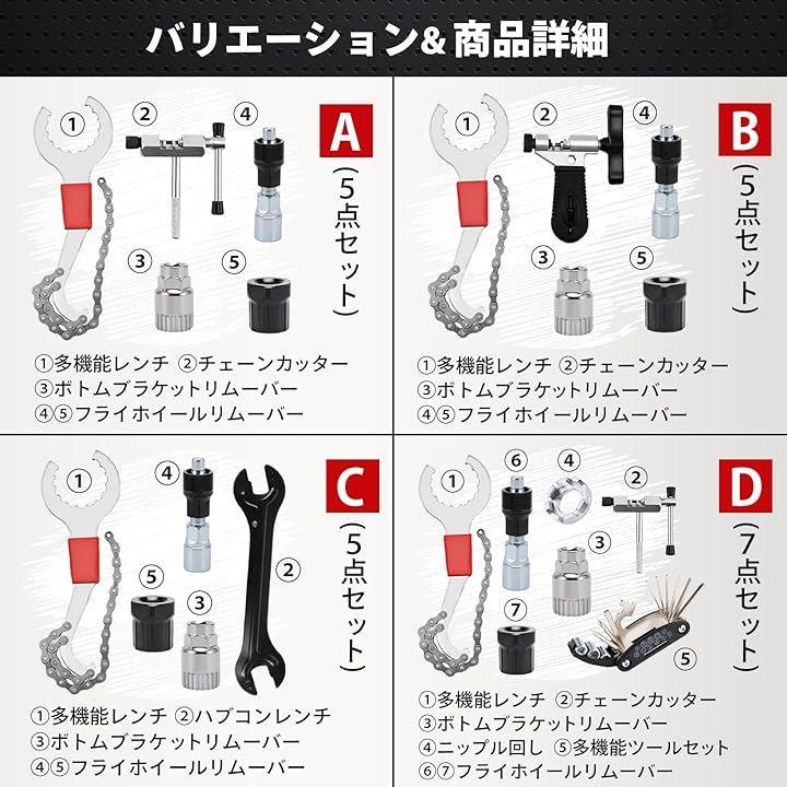 六角レンチやチェーンカッターなどの基本工具から、スプロケットリムーバーやBBツールまで、幅広い修理に対応。