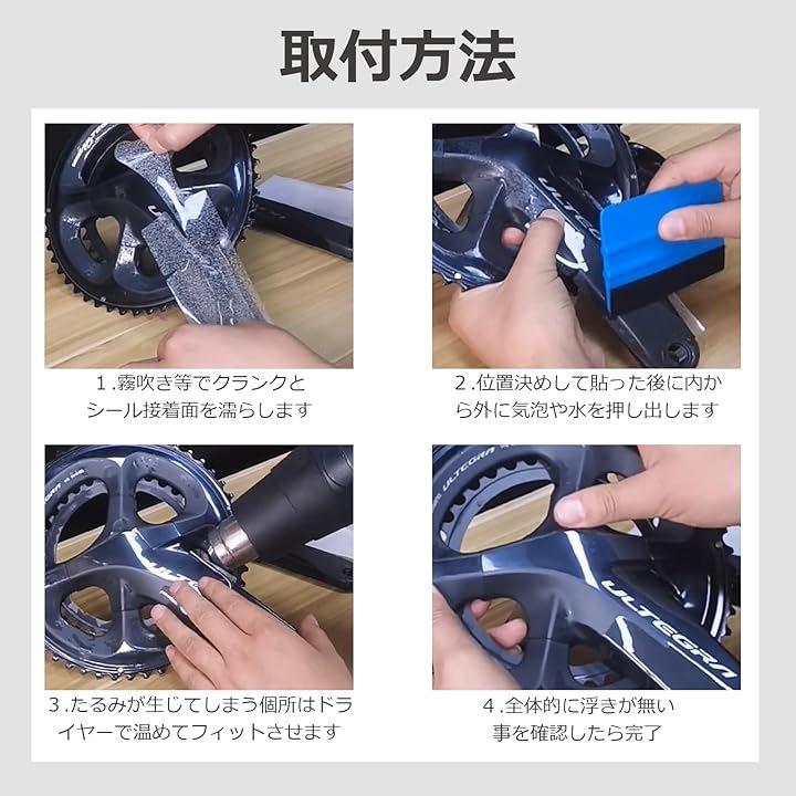 「製品仕様」「フィルム」TPU素材 厚さ0.18mm 「対応機種」*R7100: 105 FC-R7100、R7150*R8100: Ultegra FC-R8100, R8120 *R9200: Dura-Ace FC-R9200,9270*Sram等汎用:3T, Sram RED, FORCE, Margine など(専用設計ではないためカバーしできない部分が生じたり、カットが必要な場合があります)「注意点」短いクランクにはペダル側を切断して対応してください、165mm未満のクランクには対応しません。