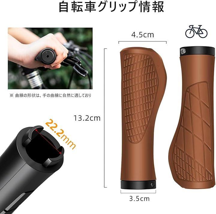 「自転車グリップ情報」:サイズ:132x45x35mm、重量:約145g/ペア、内径:φ22.2 mmセット内容:滑り止め エルゴン グリップ-1組、六角レンチ-1個(取り付け用)。