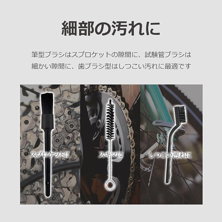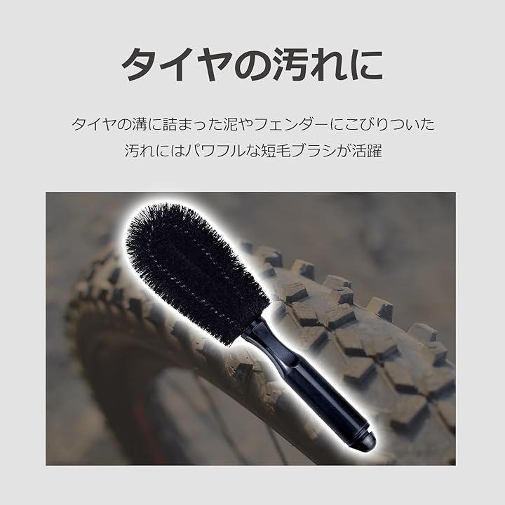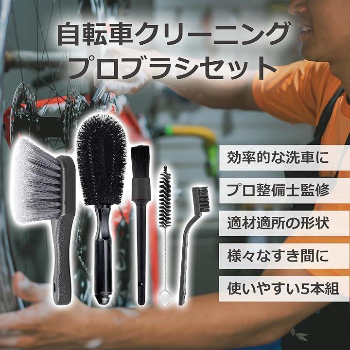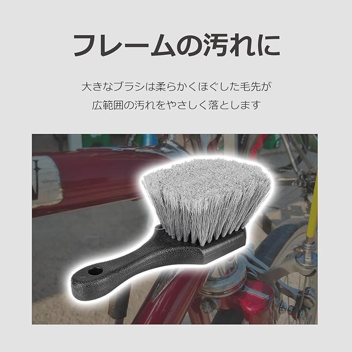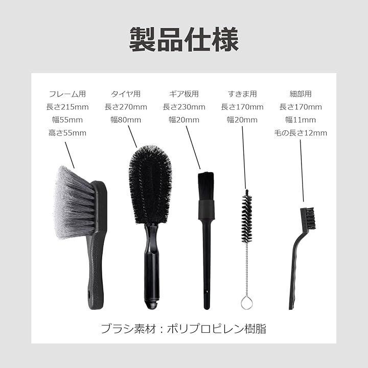 「自転車の洗車に適したプロ洗浄ブラシセット」広い部分から細部まで効率的にしっかりと汚れを落とすための適材適所の洗車用ブラシ5本セット