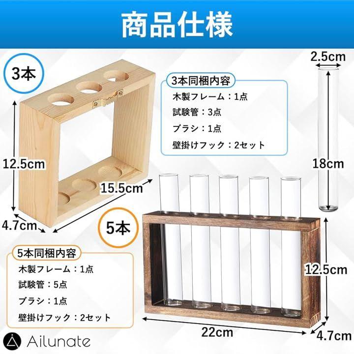「付属内容」<試験管3本タイプ>木製フレームx1、試験管x3、ブラシx1、壁掛けフックx2セット <試験管3本タイプ>木製フレームx1、試験管x5、ブラシx1、壁掛けフックx2セット