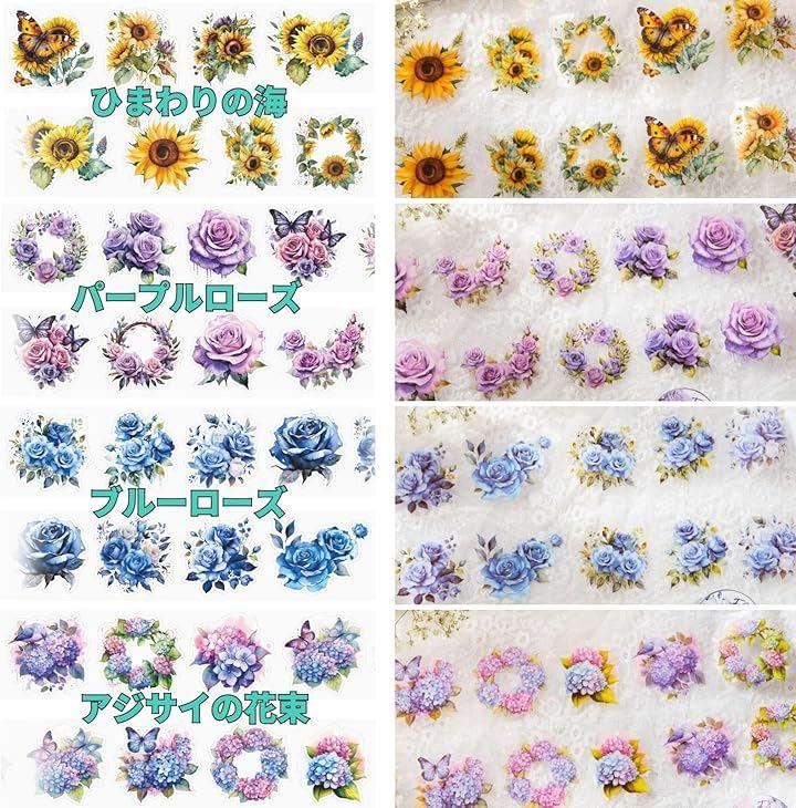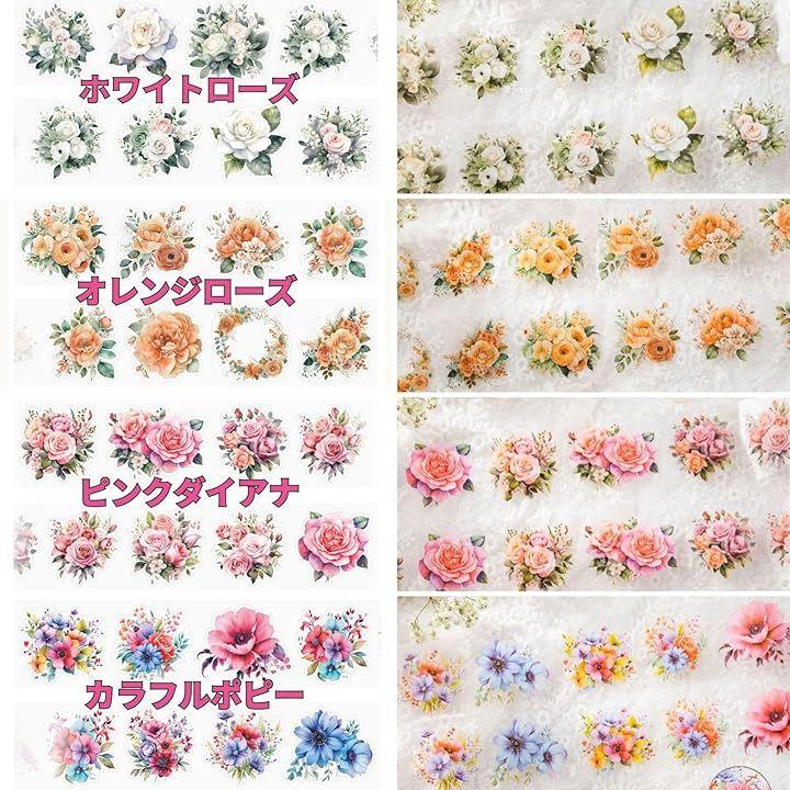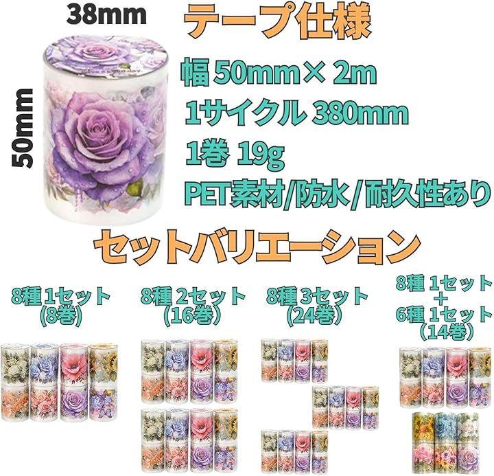 「商品仕様」[花(大)]約50mmxx2m 1ループ約350mm 1セット8種 1種8デザイン [花(小)]約50mmxx2m 1ループ約380mm 1セット6種 1種10デザイン「バリエーション」[花(大)1セット8巻、2セット16巻、3セット24巻。