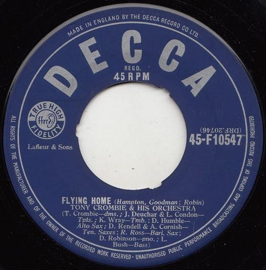 ・アーティストTony Crombie & His Orchestra・タイトルFlying Home / Early One Morning・レーベル・型番Decca 45F10547・フォーマット7インチレコード・コンディション(盤)非常に良い(EX)・コンディション(ジャケット)プレインカバー(元ジャケット/カバー無し)・コンディション(帯)オビなし・特記事項